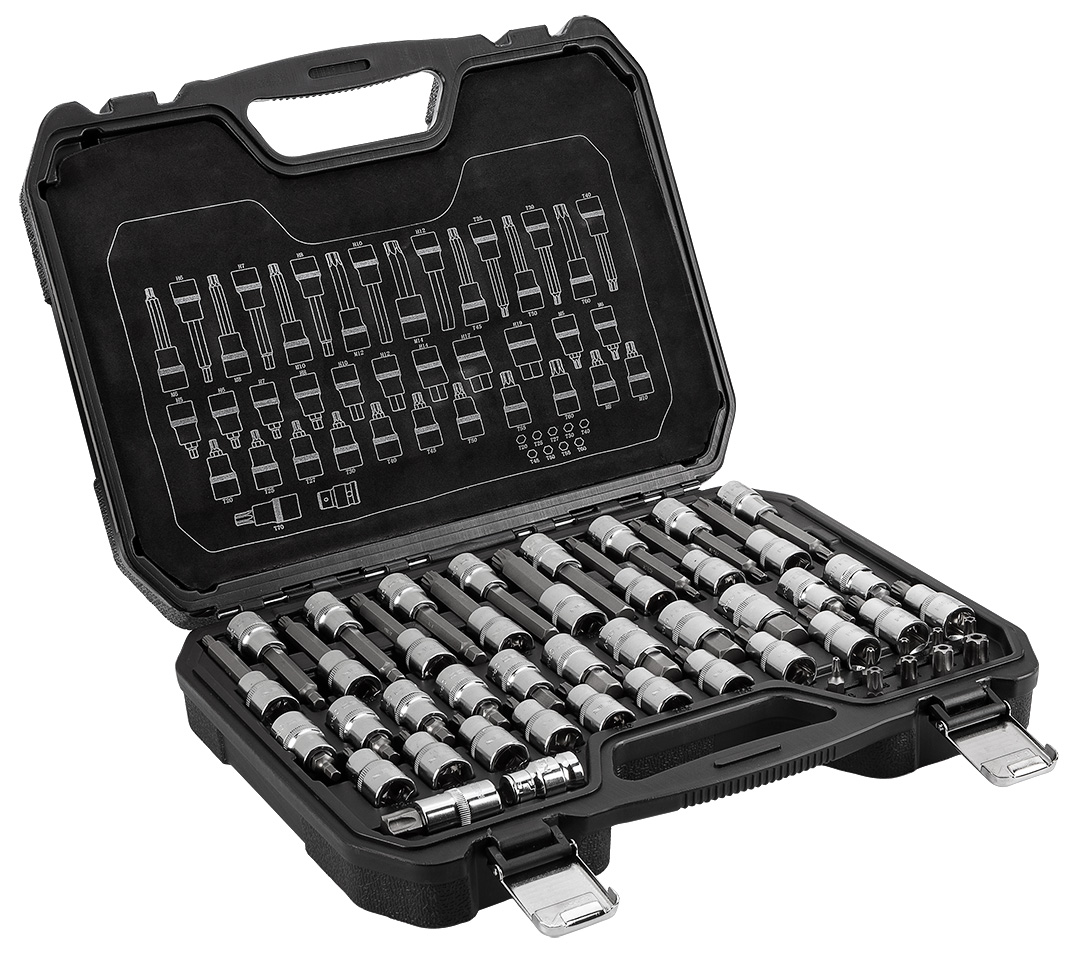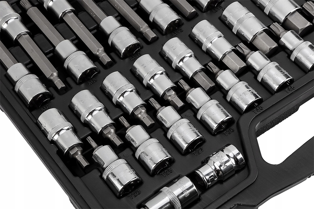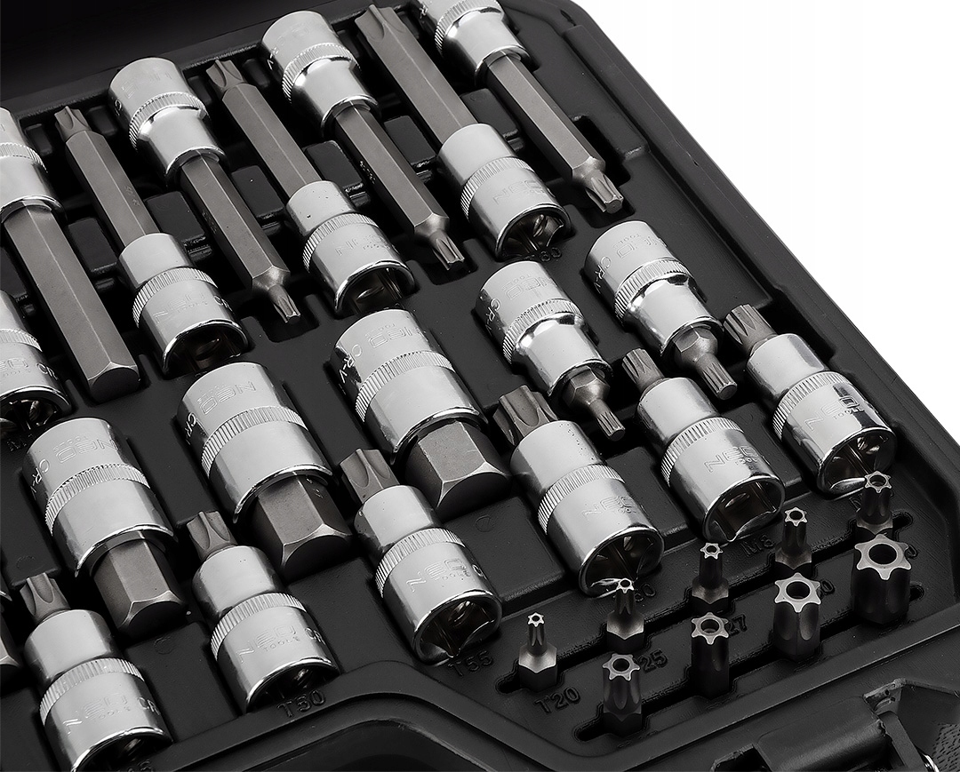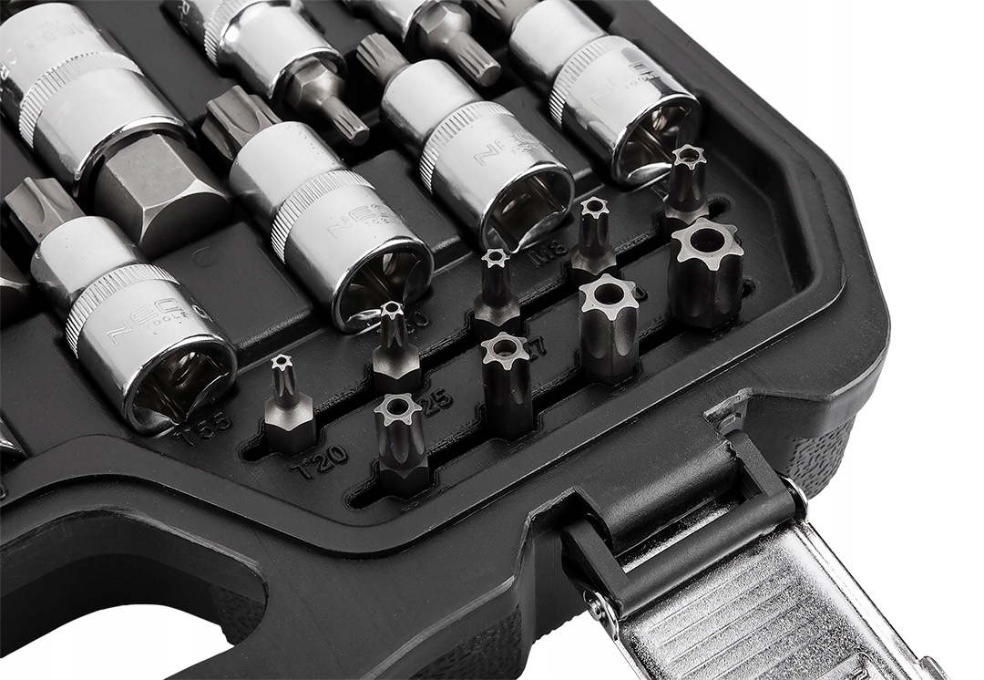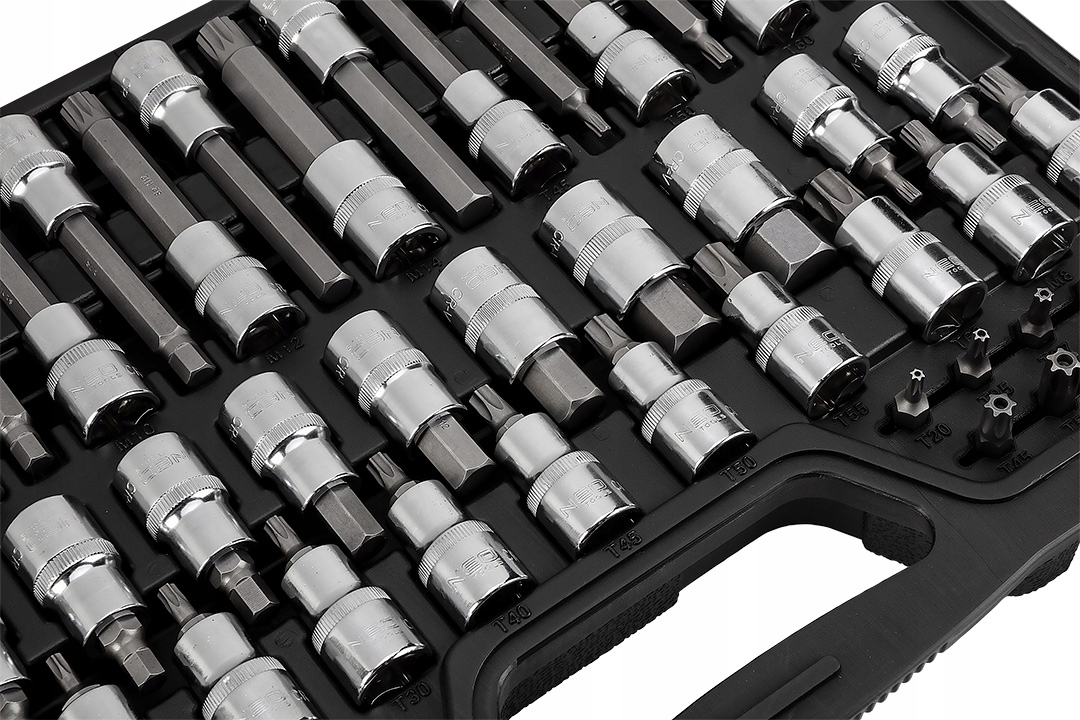 Набор бит NEO Torx (арт. 08-713) Набор из 49 предметов включает в себя широкий выбор бит и головок, в том числе длинные торцевые насадки размеров от H6 до H12 и от T25 до T60, короткие насадки Torx размеров от H5 до H19 и биты Torx 1/4 дюйма размеров от T20 до T60. Все элементы набора изготовлены из высококачественной стали, соответственно хромванадиевой. для головок и S2 для бит. Отличаются длительным сроком службы. Весь набор поставляется в практичной фирменной коробке NEO.