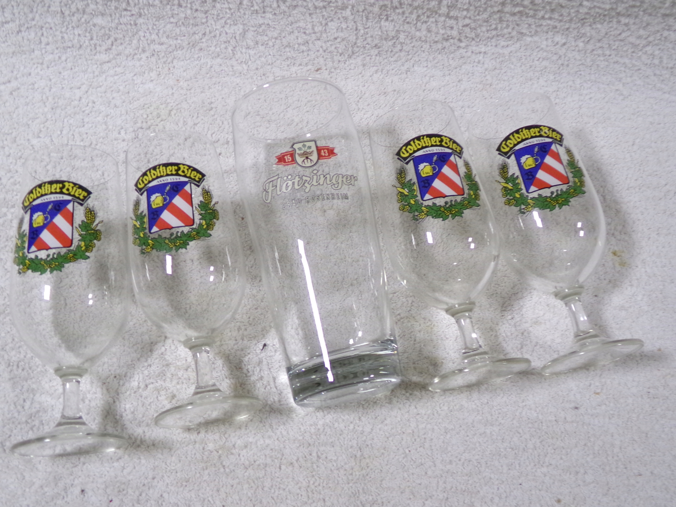 Набор пивных бокалов высотой от 17 до 18,5 см, диаметром в центре от 5,5 до 7 см, вместимостью от 200 до 500 мл, массой 0,90 кг. В очень хорошем состоянии, без повреждений.
