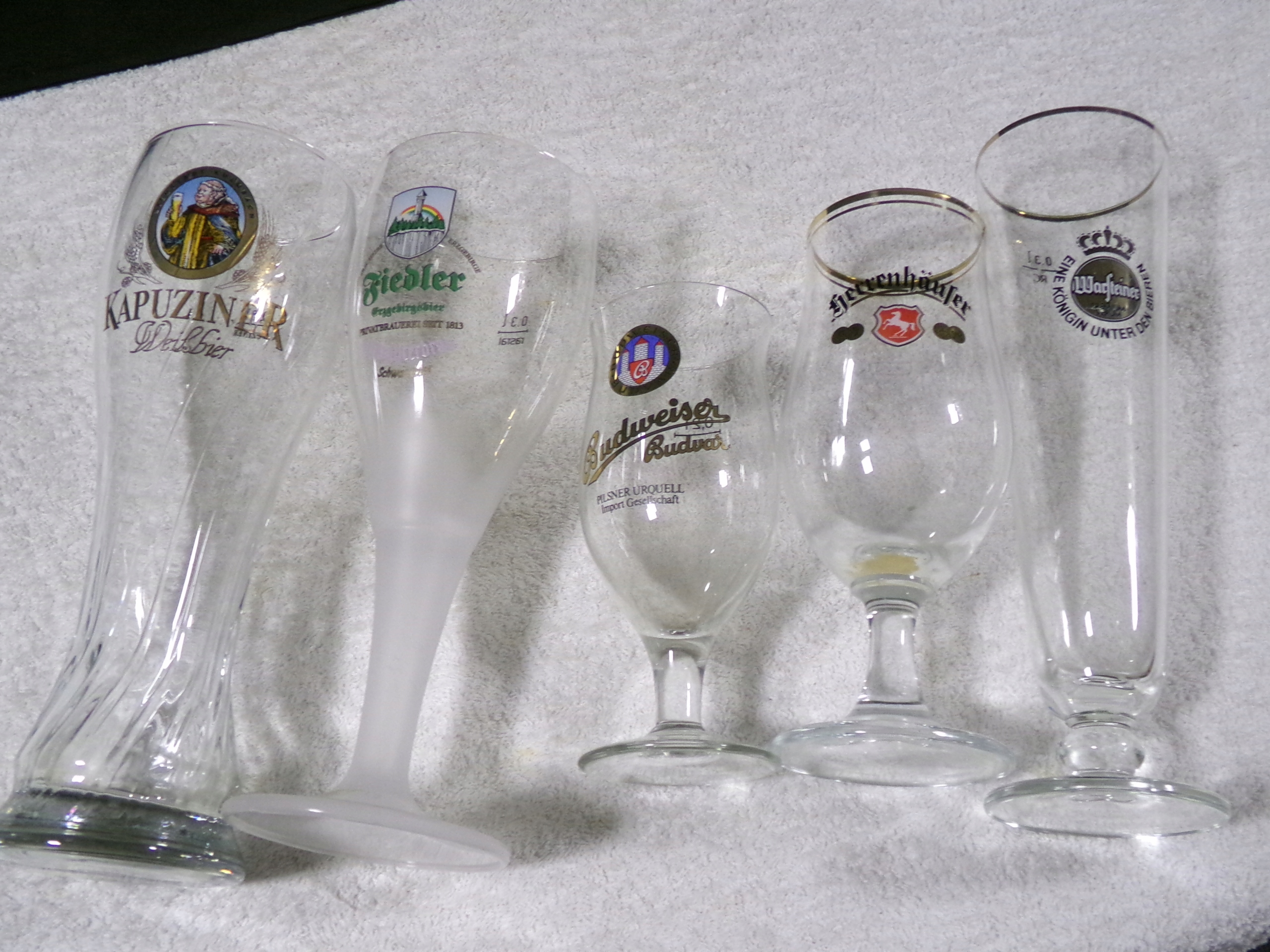 Набор пивных бокалов высотой от 15,5 до 24,5 см, диаметром центра от 6 до 7,5 см, вместимостью от 200 до 500 мл, весом 1,33 кг. В очень хорошем состоянии, без повреждений.