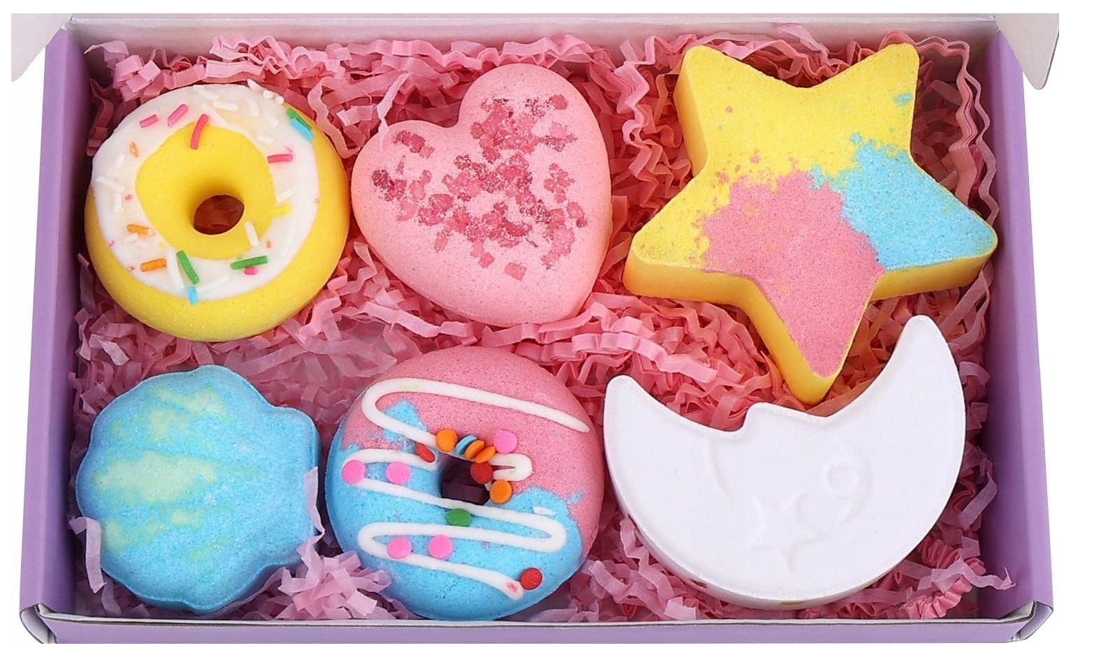 6 бомбочек для ванны ручной работы (луна, виноград, звезда, ракушка, сердце, лимонный пирог) с стойким ароматическим эффектом. Каждый шарик представляет собой уникальный многослойный взрыв цвета и вкуса. Каждый из них уникален, но каждый по-своему идеален.
