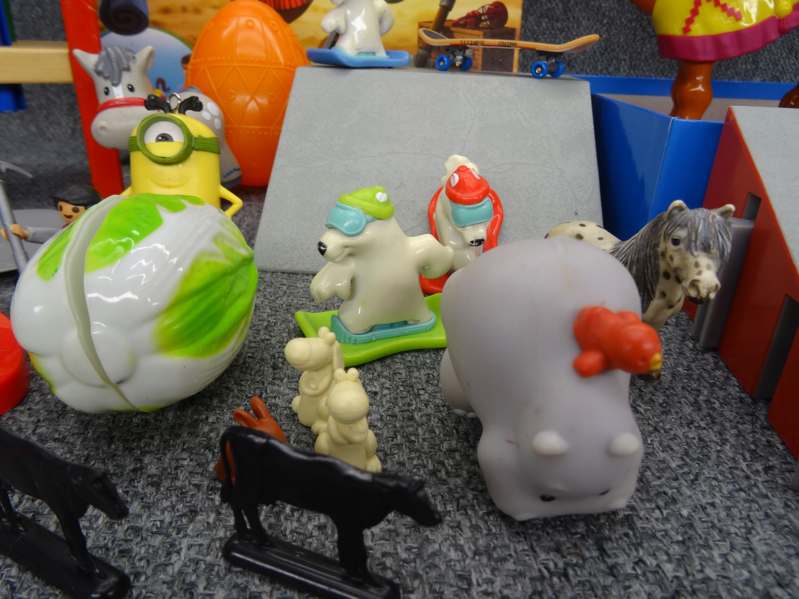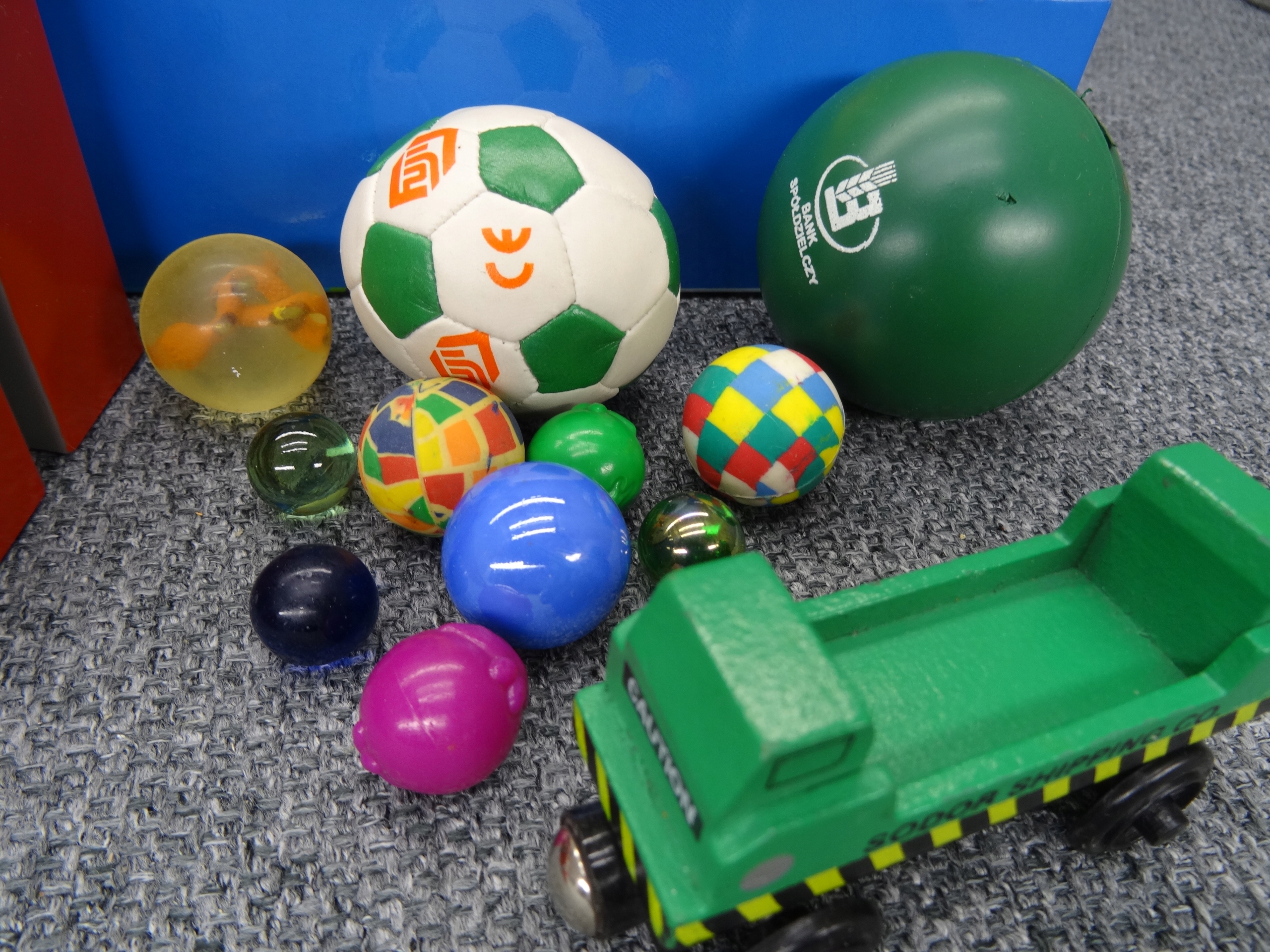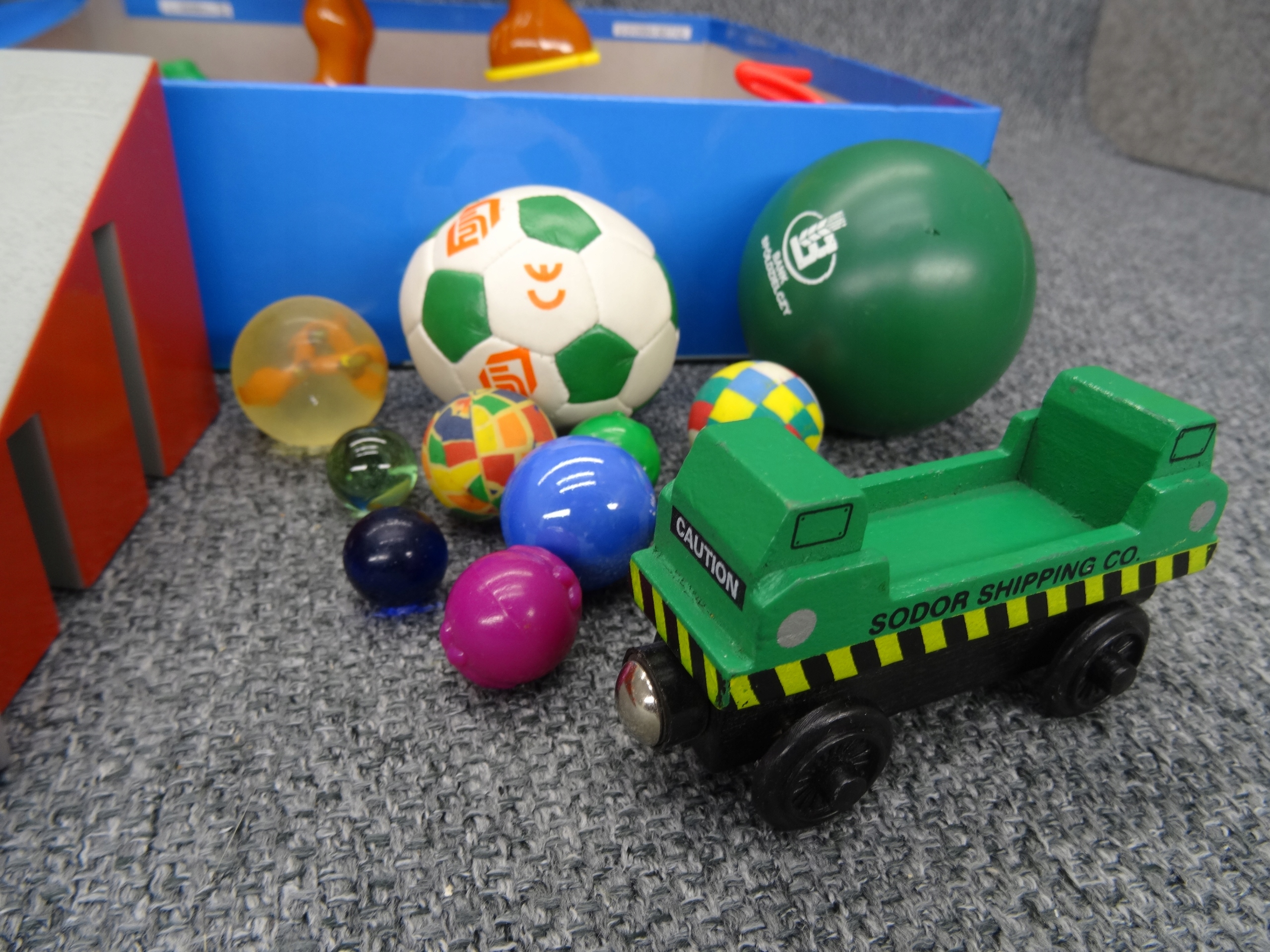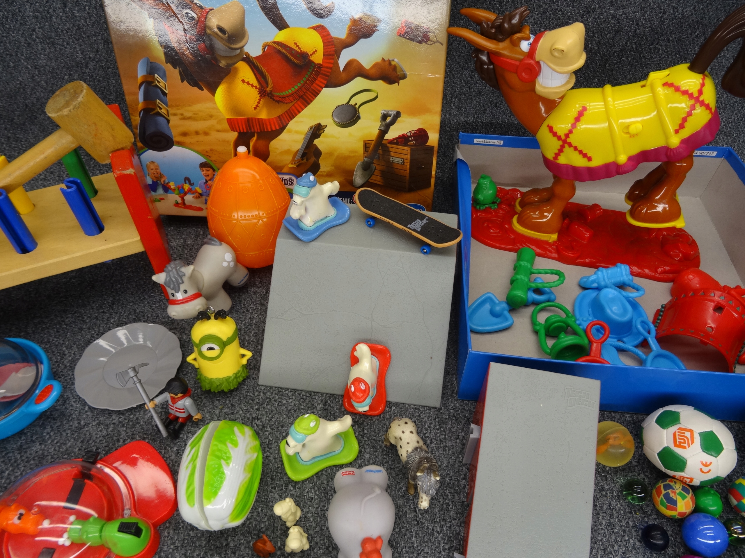 Набор различных игрушек: Бакару, фигурки, посуда, мячи, шарики, молоток и другие игрушки.