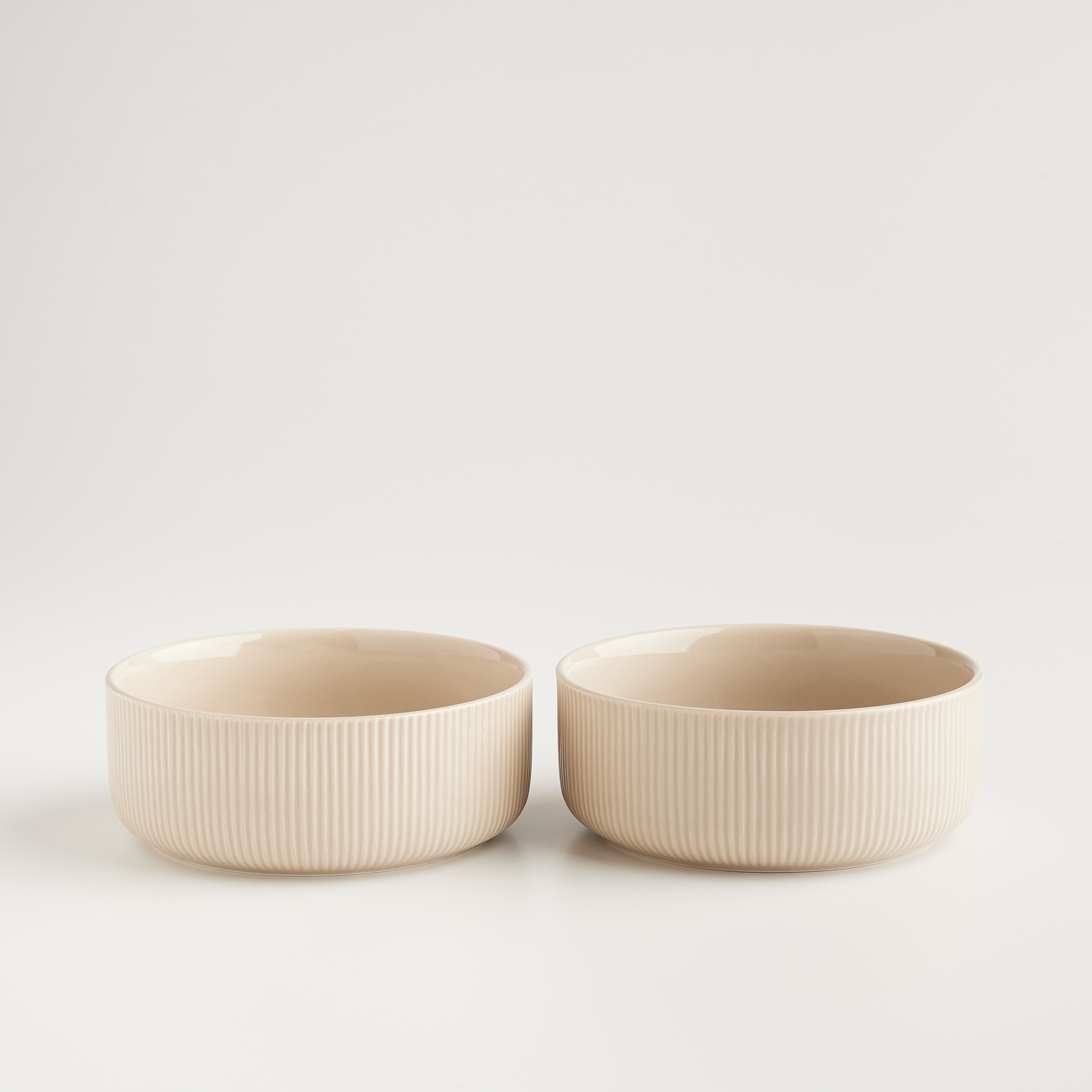 2 чаши, изготовленные из твердого фарфора, представляют собой комбинацию простоты и вневременной формы. Бежевый оттенок и тонкие канавки на поверхности делают посуды выглядеть легкими и элегантными - они подходят как с ежедневной посудой, так и с более праздничными композициями.