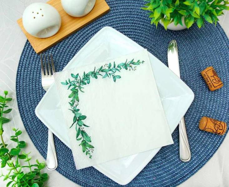 Набор одноразовых судов и салфетки с мотивом зеленых листьев Практическое и эстетическое решение для всех случаев.