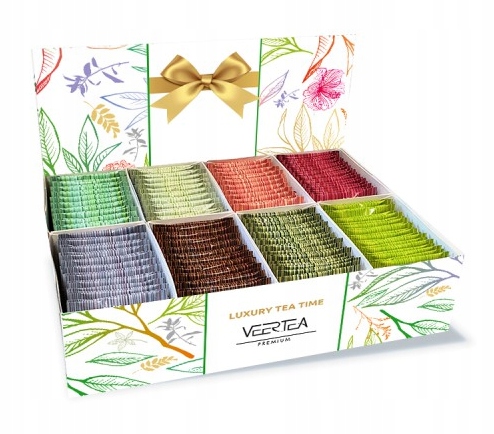 Элегантная, красочная коробка, в которой находится эксклюзивный чай VEERTEA в 8 различных вкусах, всего 200 штук.