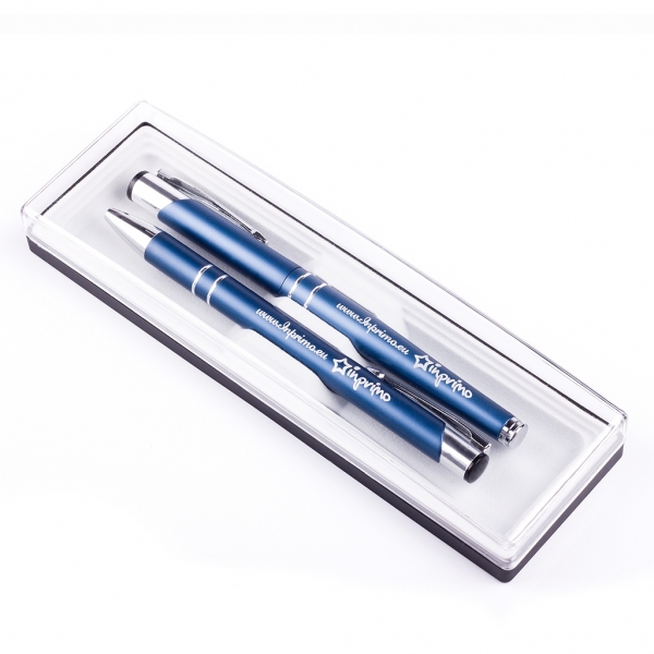 Набор для письма состоит из элегантной шариковой ручки из алюминия со сменным стержнем синего цвета и ручки с стержнями с синими чернилами. Цвет лака, которым покрыт алюминий, выбирает заказчик. Набор отлично смотрится в качестве рекламного гаджета, на нем лазерной гравировкой находится логотип компании или название бренда. Стержень ручки активируется нажатием кнопки, и ручка готова к письму после снятия колпачка, защищающего наконечник. Набор помещен в красивую коробку.