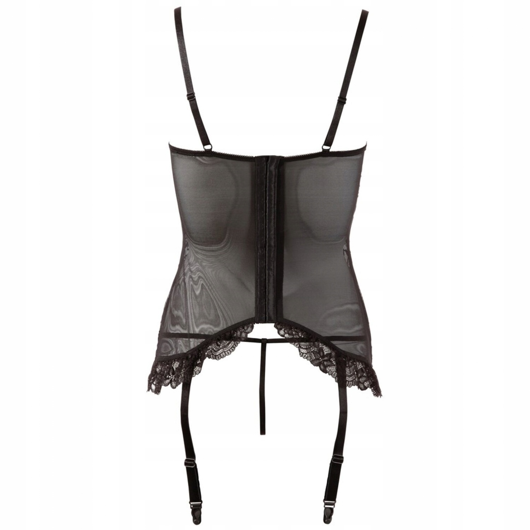 Черный корсет – это не обычное эротическое белье. Специально разработанные открытые, слегка жёсткие чашки поставят вашу красивую грудь на первое место. Застежка на крючок и петлю сзади позволяет легко надевать и снимать. Внизу прикреплены бретельки для подвязок, которые можно отстегнуть и отрегулировать любым способом. В комплект входят чувственные стринги с вырезом, позволяющие спонтанно развлечься. Материал: 90 % полиамид, 10 спандекс.
