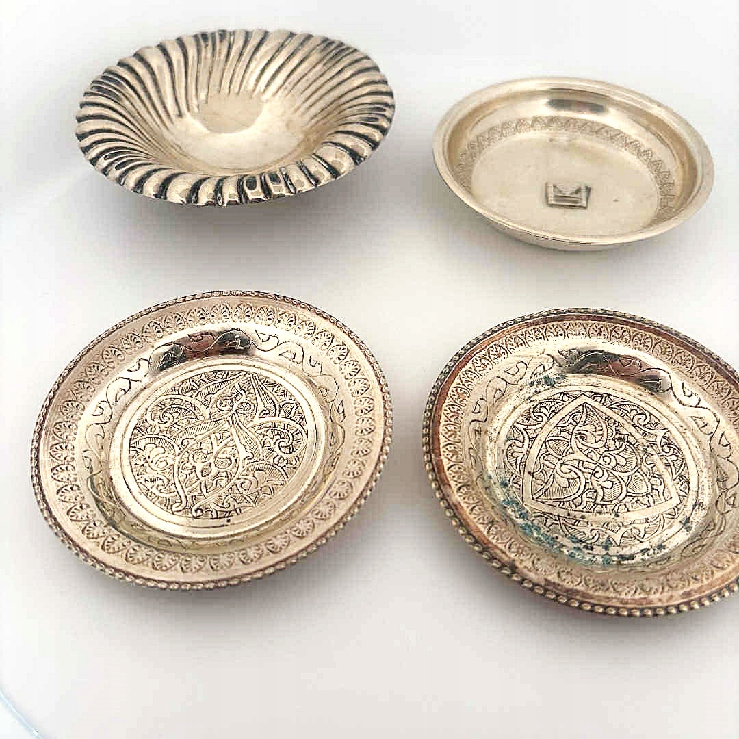 ☑️Уникальный набор из четырех небольших декоративных чаш из серебра, представляющих различные стили ювелирного дела – от классической элегантности до восточных, замысловато гравированных орнаментов.
