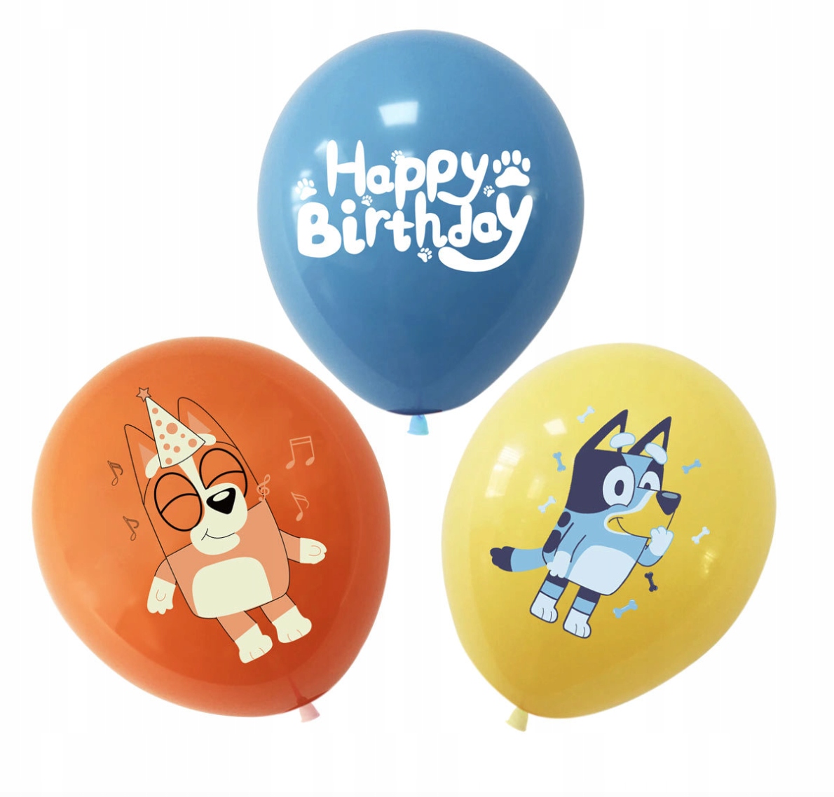 W Также мы предлагаем другую продукцию из серии Bluey: талисманы, воздушные шары, топперы, гирлянды, стаканчики, тарелки, салфетки и наборы наклеек.