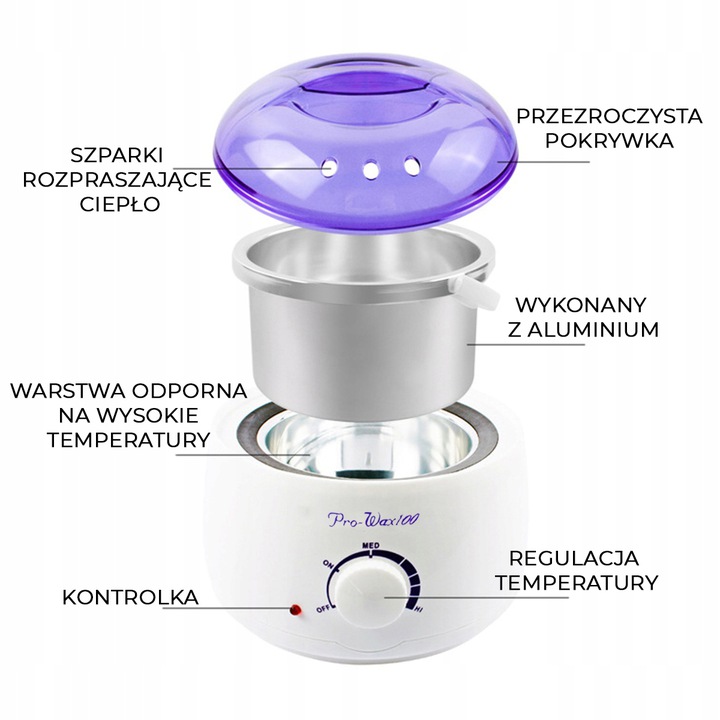 "Перед использованием прочитайте руководство пользователя. Устройство безопасно и простое в использовании. Для профессионального использования. Его можно использовать для любого типа воска. На устройстве вы можете согреть банки, доступные в нашем предложении до 800 мл и жесткого воска.