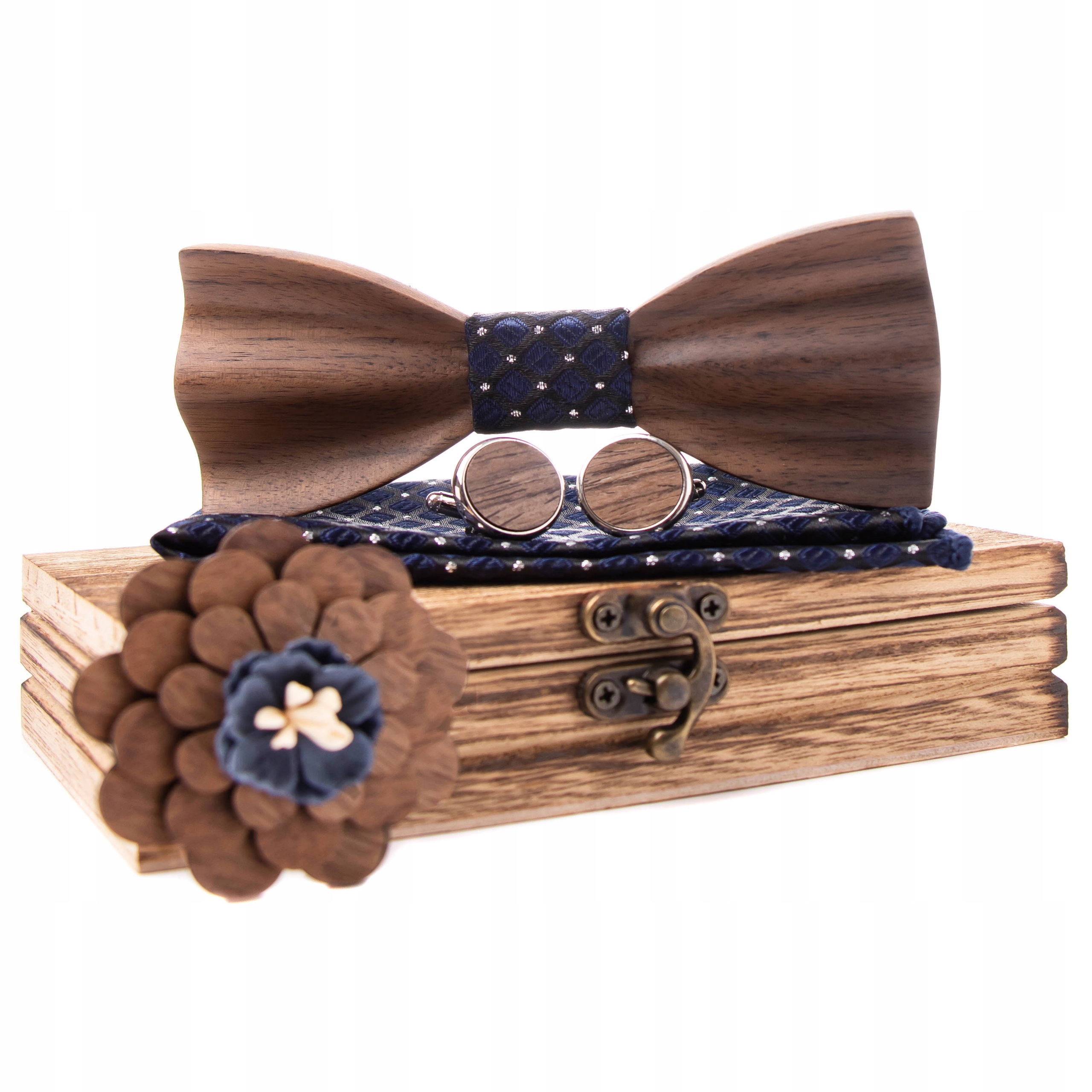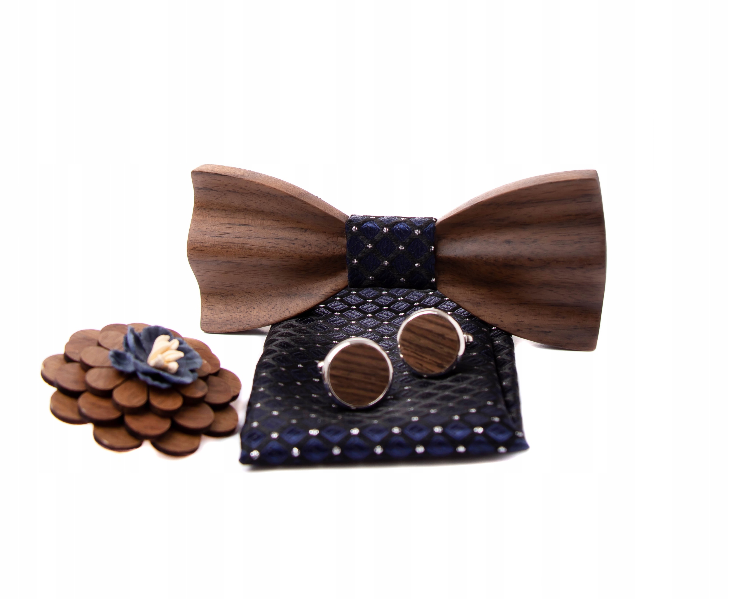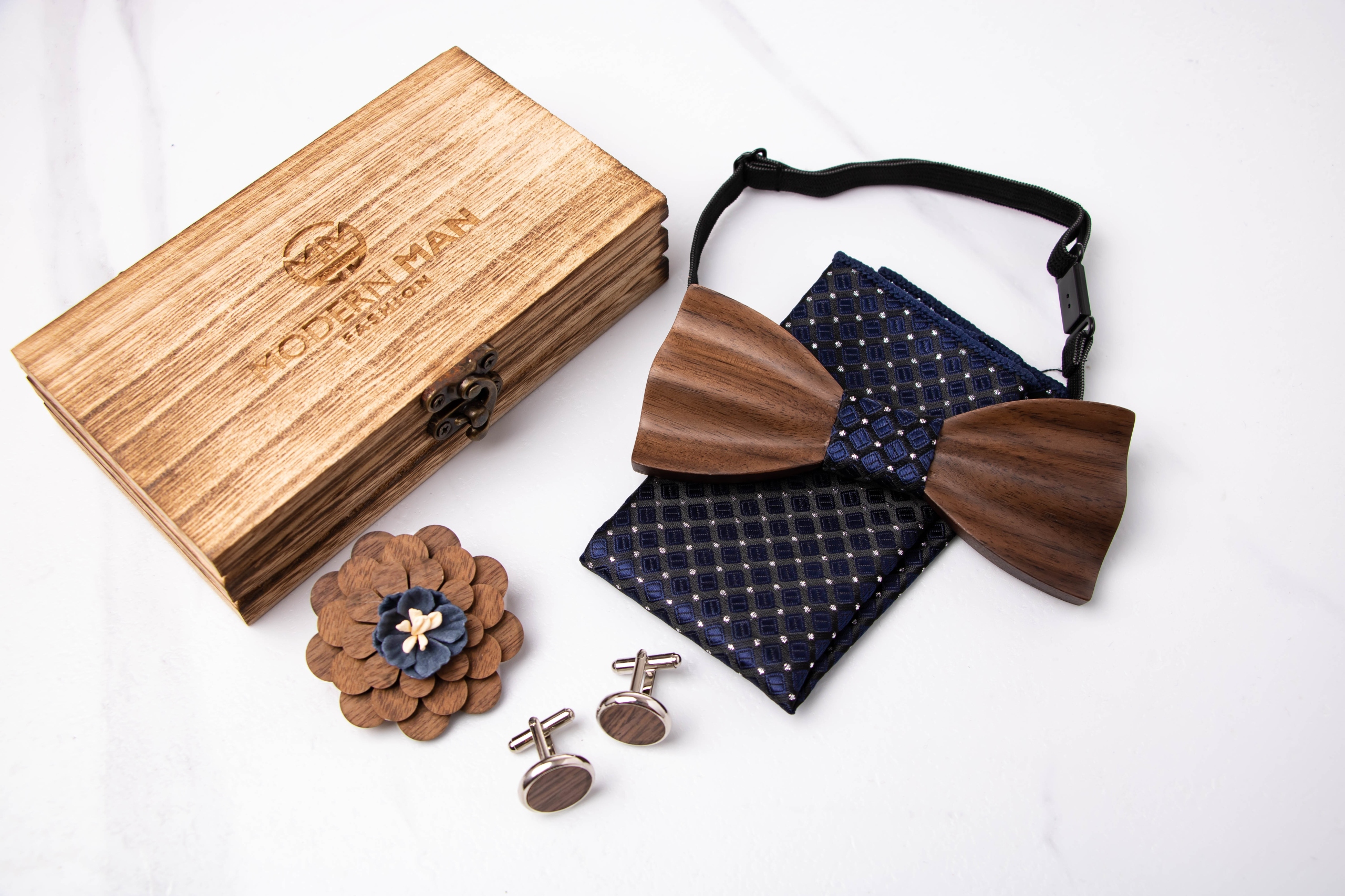 Деревянный галстук-бабочка с нагрудным платком, запонками и брошью