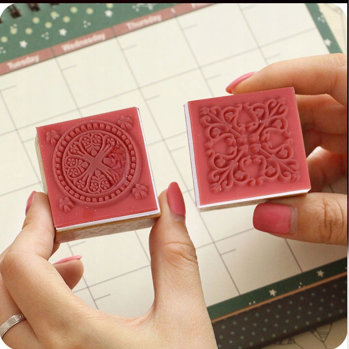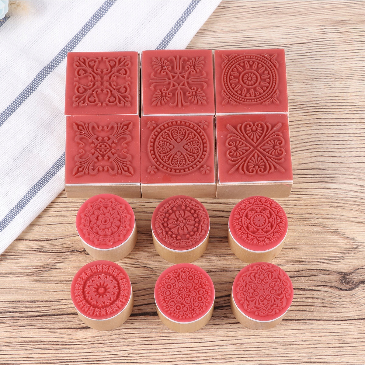 ✅ 6 штук цветочного узора в разных стилях и 6 видов деревянных штампов с рисунком в форме кругов и квадратов.