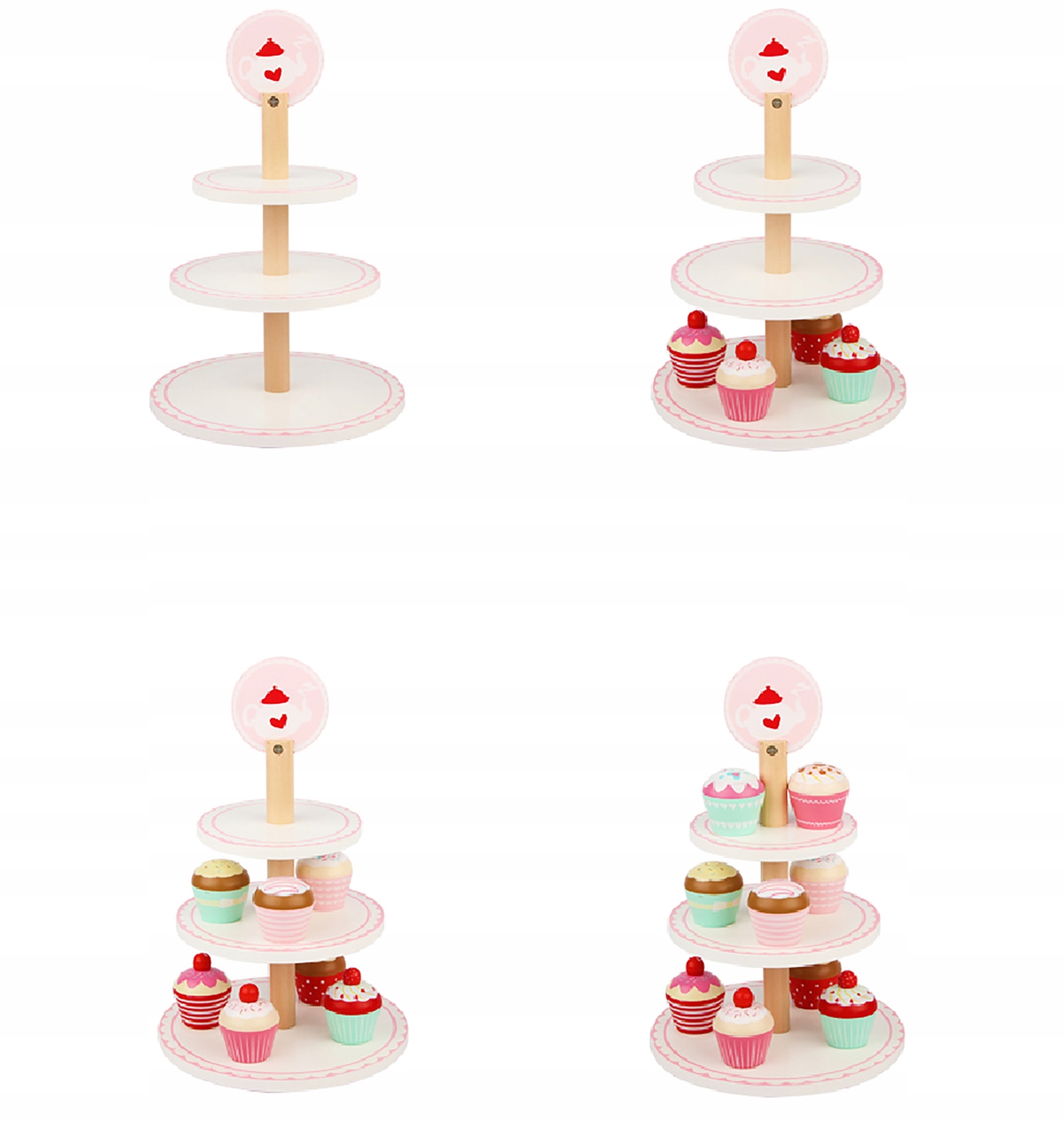 Этот соблазнительный набор деревянных кексов с тарелкой станет прекрасным дополнением детской кухни или магазина. Каждый кекс имеет уникальный стиль, разные цвета и украшения. Четыре капкейка сверху дополнительно украшены очаровательной вишенкой. Уникальным элементом набора также является стильная и практичная двухъярусная подставка для торта, на которой можно красиво презентовать капкейки. Сохраняйте элегантность при встрече с друзьями или семьей.
