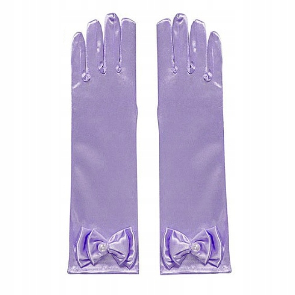 Перчатки изготовлены из эластичной лайкры фиолетового цвета. Украшен милыми бантиками.