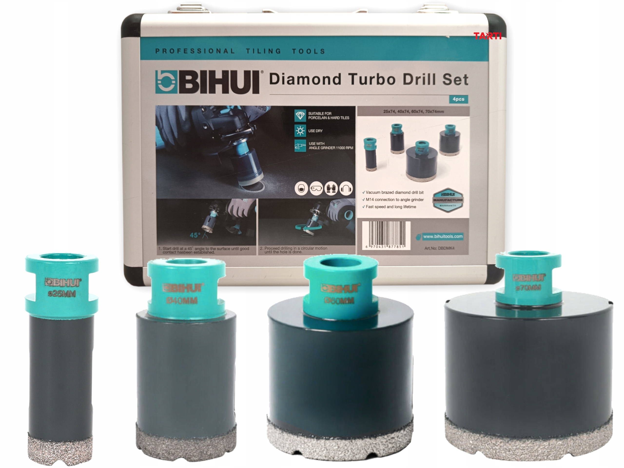 Набор алмазных буровых отверстий для керамики + чемодан 25/40/50/70 мм