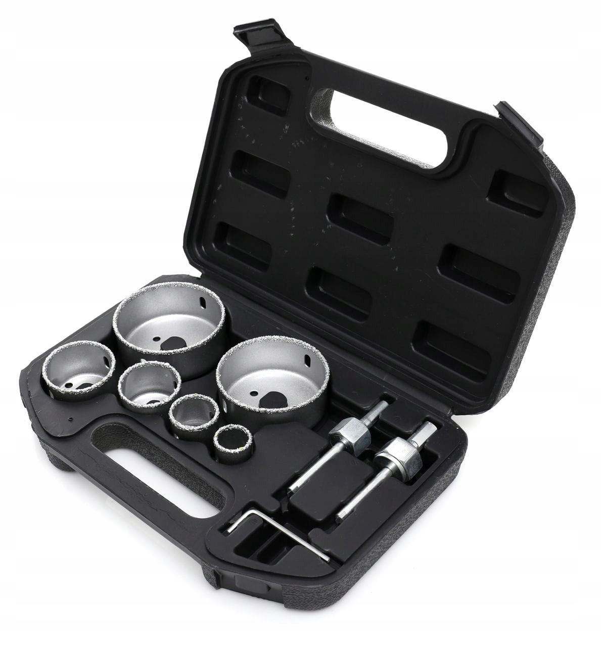 В комплект KD10285 входят 6 кольцевых пил размерами: 22, 29, 38, 44, 67, 73 мм, шестигранный ключ и два адаптера со сверлом.