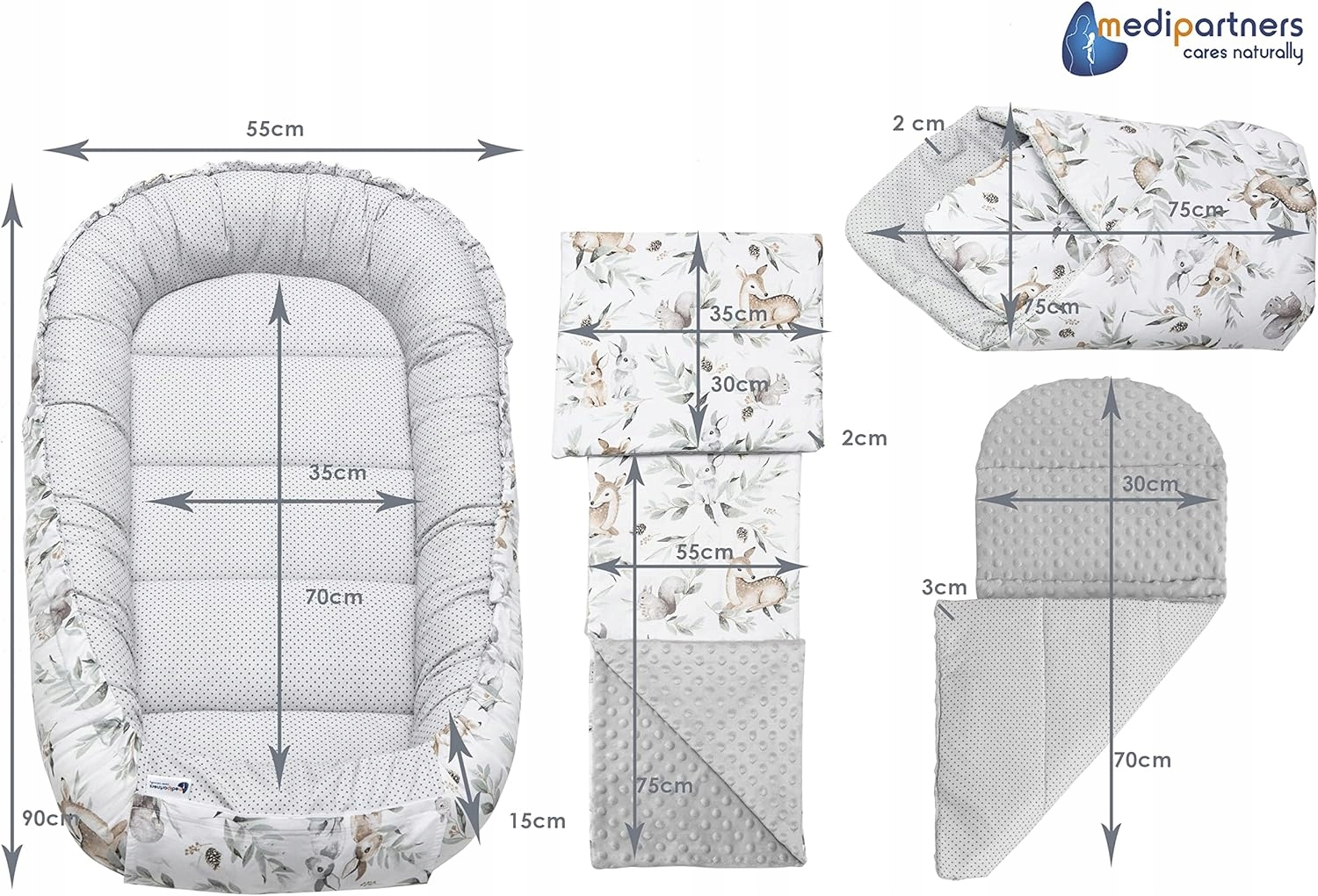 Состав набора: 1. Двусторонний кокон из 100% хлопка. Внешние размеры: 100 см х 60 см х 15 см. Размеры внутренних частей: 70 см х 35 см. 2. Съемная вставка: 70 см х 30 см х 3 см. 3. Размеры плоской подушки: 30 см х 35 см х 2 см. Размеры одеяла для ползания: 55 см х 75 см х 1 см. 5. Погружная подушка 100% хлопок 75 х 75 см. Вкладыш, плоскую подушку и ползущее одеяло можно использовать с обеих сторон (одна сторона из хлопкового вкладыша, другая из нежной ткани Minky). Используемые материалы: - 100% хлопок, плотность 125 г/м2 - 100% полиэстер - Minky - плотность 380 г/м2 - 100% полиэстер - шарик из антиаллергенного силикона - заполняет края булочки. материал - 100% полиэстер - вата 300 г/м2 - наполнитель кокона - плоский (как в коконе, так и в использовании). Все используемые материалы сертифицированы Oeko-Tex Standard 100. Инструкция по применению: стирать при 30°C, деликатная программа, максимальная скорость отжима 800, гладить хлопчатобумажную ткань при температуре до 110 градусов Цельсия, использовать деликатные чистящие средства, не используйте отбеливатель, не сушите в стиральной машине