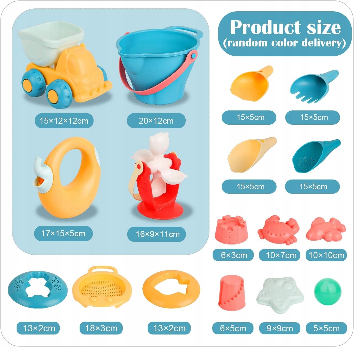 В комплект входят пляжный грузовик, лейка, водяное колесо, пляжное ведро, сито для песка, 7 формочек для замковых животных, 4 набора пляжных инструментов. Игрушки для песка поставляются в сетчатом мешочке, поэтому дети могут самостоятельно разложить свои игрушки.