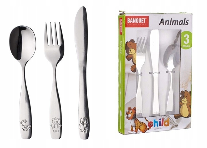 Набор столовых приборов ANIMAL из нержавеющей стали для детей, 3 предмета. В набор входит ложка длиной 13,8 см, нож длиной 17 см, вилка длиной 14,5 см с тиснением животных мотивов на ручке.