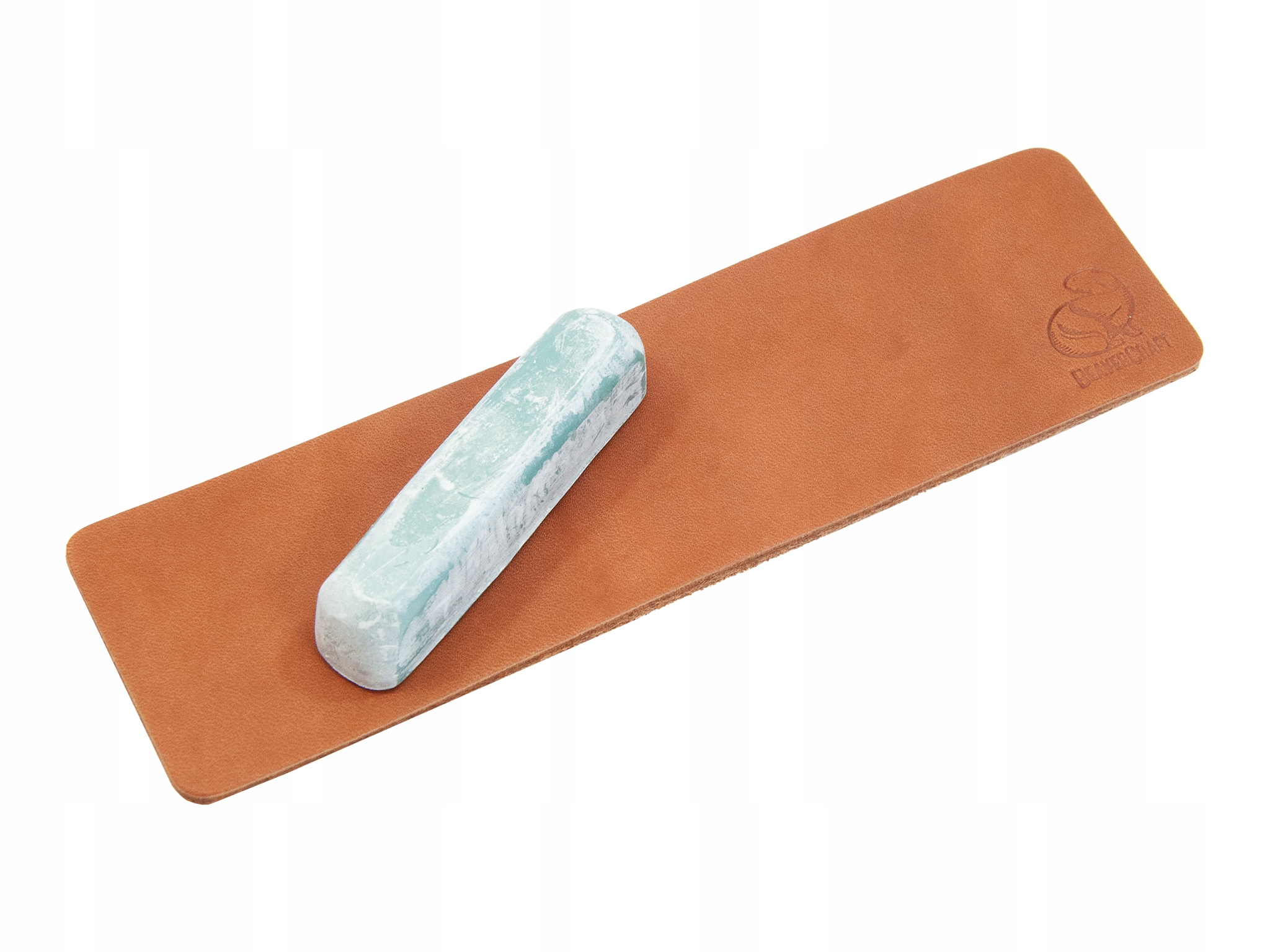 - Нанесите полировальную пасту на шершавую сторону (так называемую мякоть) (можно и без пасты) и перемещайте лезвие инструмента, аналогично заточке на камне. Однако в данном случае мы делаем это только в одном направлении (от лезвия) и прикладываем гораздо меньше силы – применяемое давление должно быть очень небольшим. Протаскиваем лезвие по всей длине полировального станка. Желательно сохранять угол заточки инструмента. Обычно достаточно десятка-другого взмахов, иногда нужно около 20-30.