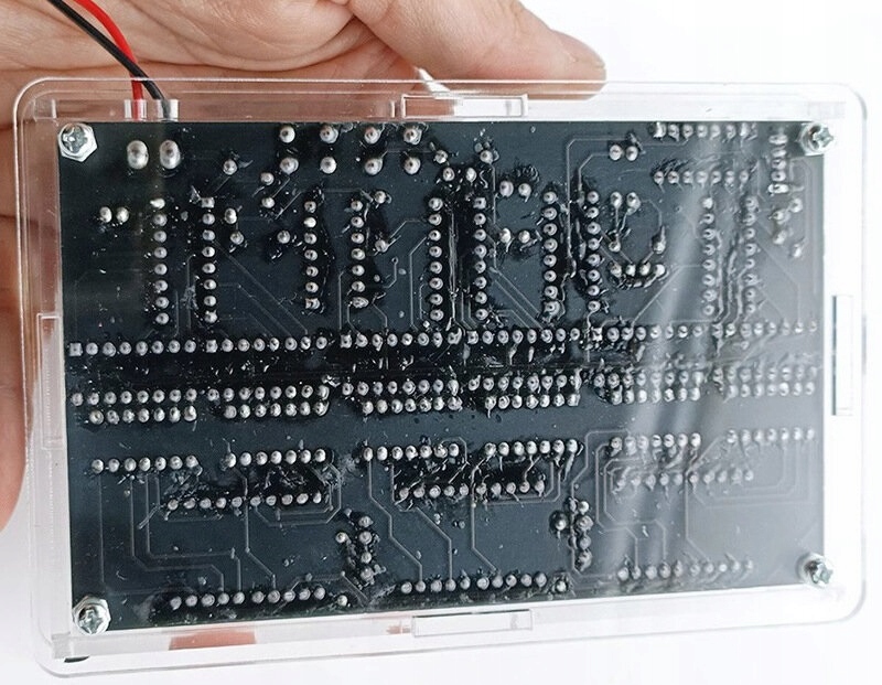 В комплект входят все необходимые компоненты для сборки, включая печатную плату, шесть 7-сегментных светодиодных индикаторов, резисторы, диоды, конденсаторы, кварцевый генератор и гнезда для интегральных схем. Питание часов осуществляется через порт USB, что исключает необходимость во внешнем источнике питания. После сборки устройство выглядит эстетично и может выполнять как образовательную, так и практическую функцию.