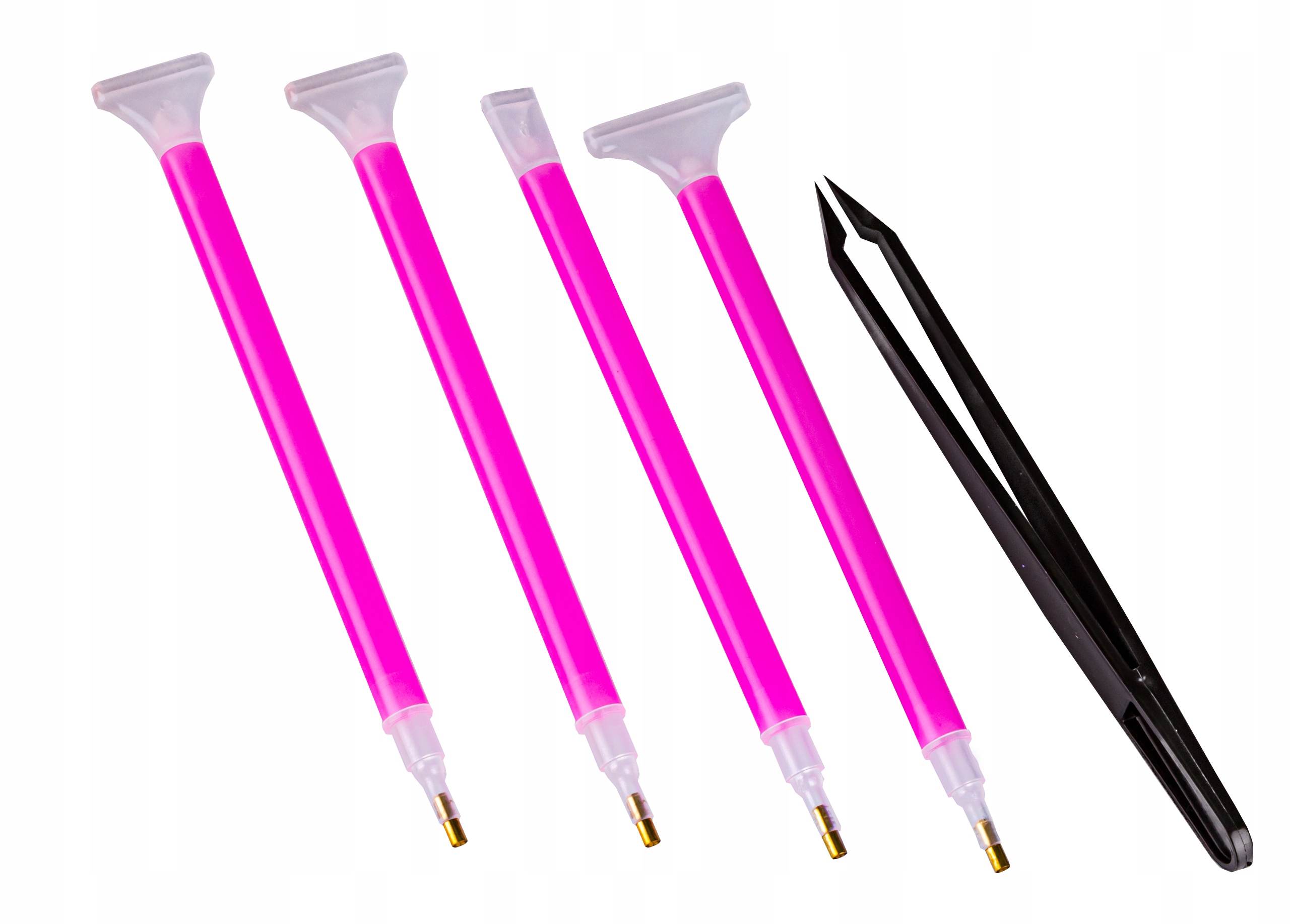 В набор также входят четыре разных типа ручек для нанесения алмазов. Они имеют разные концы, что позволяет одновременно наносить на полотно разное количество бисерин.