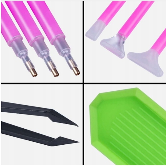 - МНОЖЕСТВО ЭЛЕМЕНТОВ В НАБОРЕ. НАБОР - в комплекте имеется множество элементов для алмазной вышивки, которые сделают наклеивание алмазных картинок намного удобнее и практичнее. В набор входят такие аксессуары, как 4 «ручки», органайзер для бриллиантов, валик для прижима, пинцет, клей, сумка для инструментов, 3 кюветы и наклейки для описания бриллиантов на органайзере.