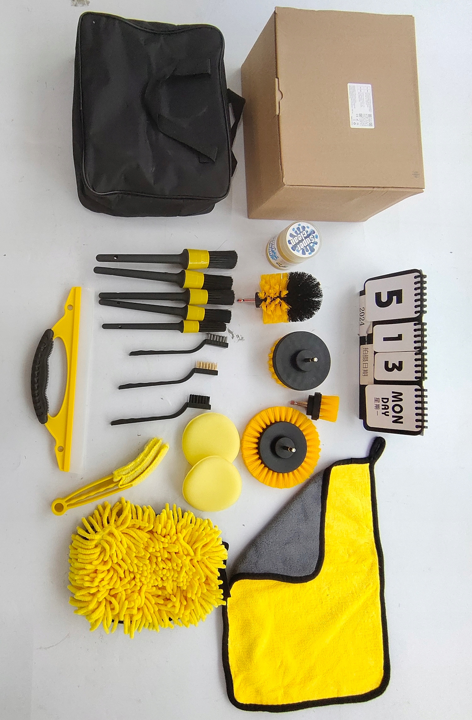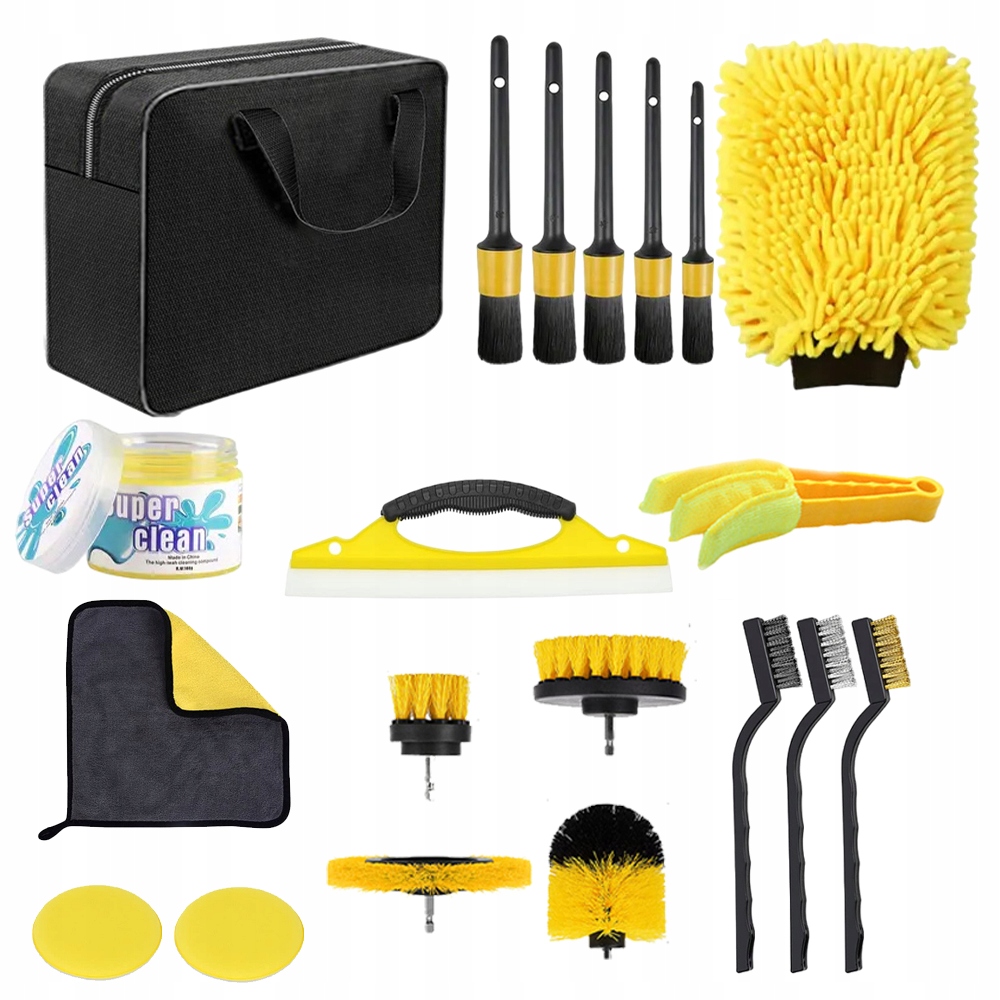 🚗 Набор для чистки автомобиля из 20 предметов: включает 5 щеток для чистки автомобиля, 4 щетки для дрели, 1 перчатку из микрофибры для автомойки, 1 ткань для чистки из микрофибры, 2 губки для полировки, 1 щетку для автомобильного кондиционера, 3 проволочные щетки, 1 гель для чистки автомобиля, 1 стеклоочиститель и 1 дорожную сумку.
