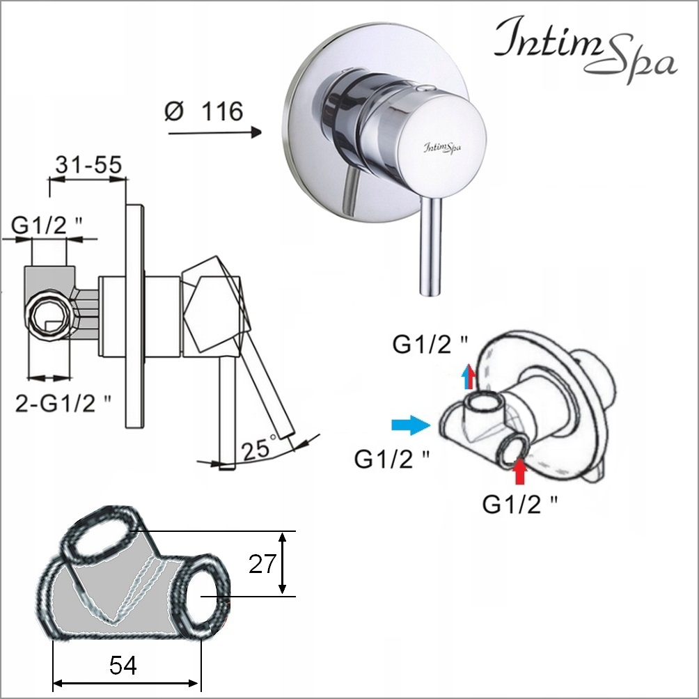 Круглый набор скрытого монтажа со смесителем холодной/горячей воды и соединением/ручкой-держателем (латунь) для установки в удобном месте.