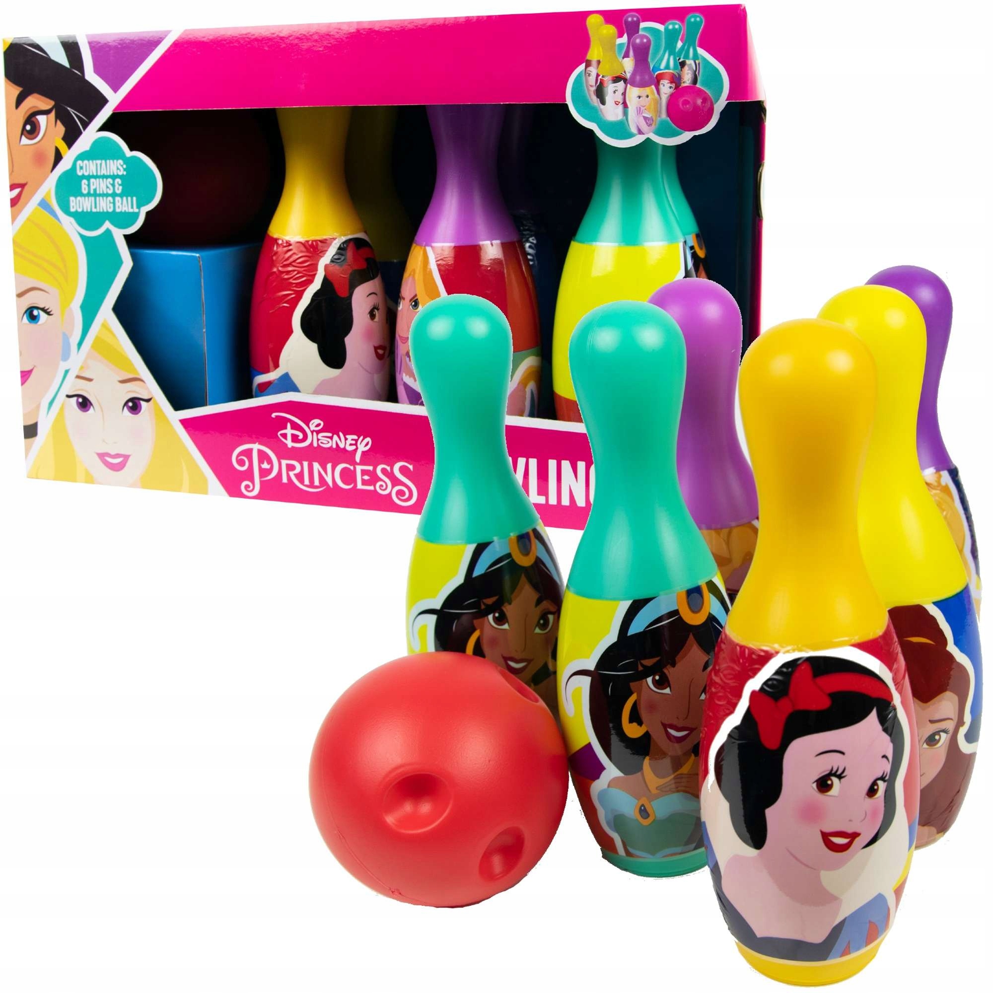 В комплект входит 6 светлых кеглей трех цветов: фиолетового, желтого и бирюзового с изображениями принцесс Диснея, в том числе Рапунцель, Белоснежки, Жасмин и красныйшар.