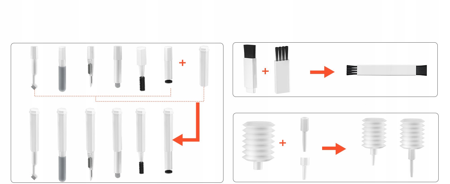 Набор для чистки клавиатуры 20 в 1: В комплект для чистки компьютера входит более 20 аксессуаров, в том числе выдвижная щетка для клавиатуры, съемник клавишных колпачков, экстрактор, воздуходувка, ручка для чистки Airpod, флокированная губка, мини-мягкая щетка, щетка для объектива, щетка для чистки корпуса наушников и щетка для камеры, чистящие спреи, ткань из микрофибры, щетка для головки, штифт для выбора вкладок.