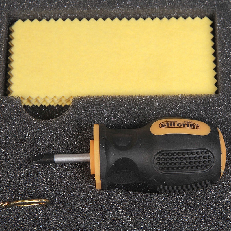 Пластиковый футляр с губкой, в котором находится: длинный вращающийся шомпол для чистки ружей. Набор из четырех кистей (хлопчатобумажная, латунная, спиральная, пластиковая), тканевый кончик. Набор хлопчатобумажных тканей, отвертка, кисточка, 125 мл оружейного масла и 2 тампера.