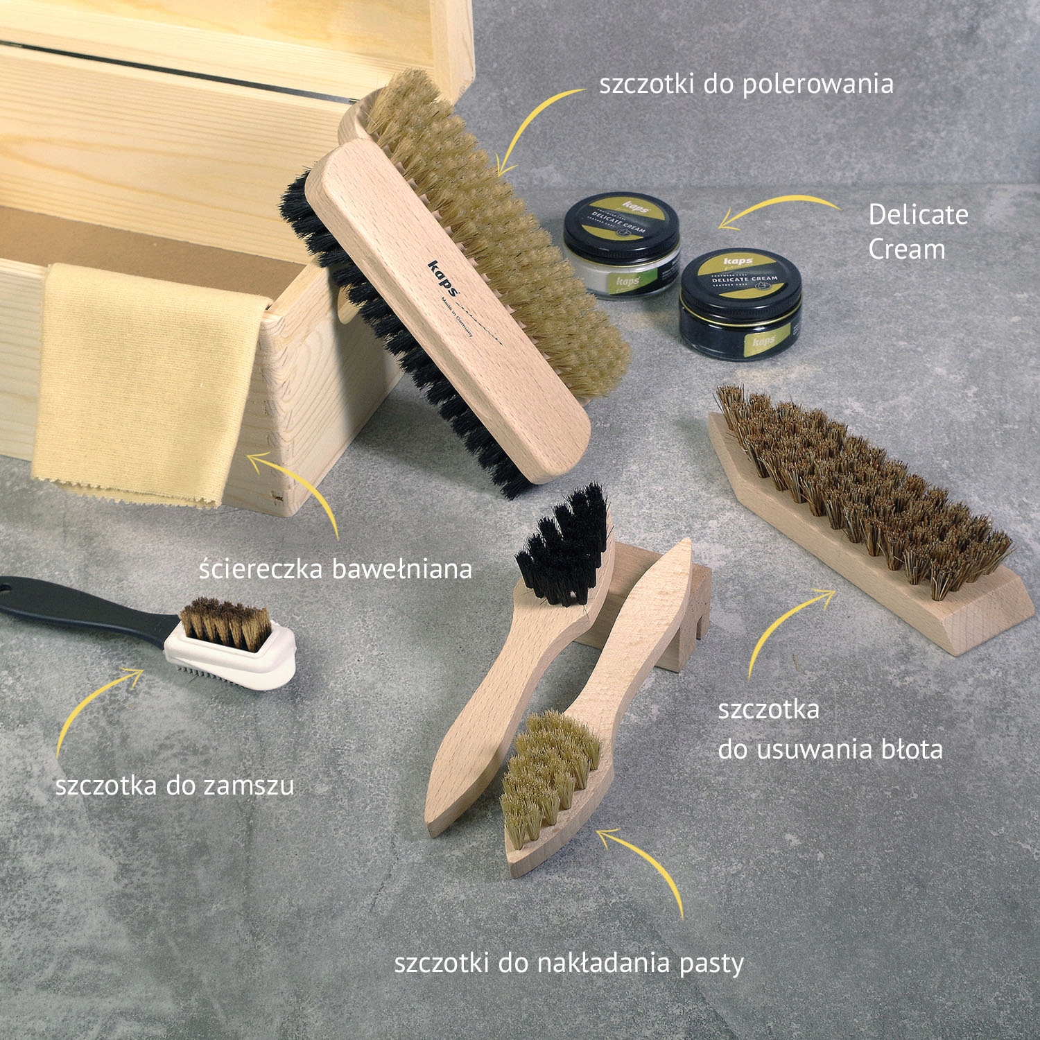 Чистая и ухоженная обувь – одна из наших визитных карточек. Они являются инвестицией на долгие годы и требуют надлежащего ухода, чтобы служить нам как можно дольше. Теперь вам больше не придется искать подходящую зубную пасту или щетку! Предлагаемый нами набор для ухода за обувью содержит все необходимое для правильной чистки и блеска кожаной обуви. Состоит из 9 высококачественных средств, предназначенных для правильного ухода за обувью, помещенных в удобно организованную коробку из 100% натуральной древесины сосны. Отныне все необходимые аксессуары будут в одном месте, и можно не беспокоиться о том, что щетки и кремы для обуви останутся в беспорядке в обувном шкафу.