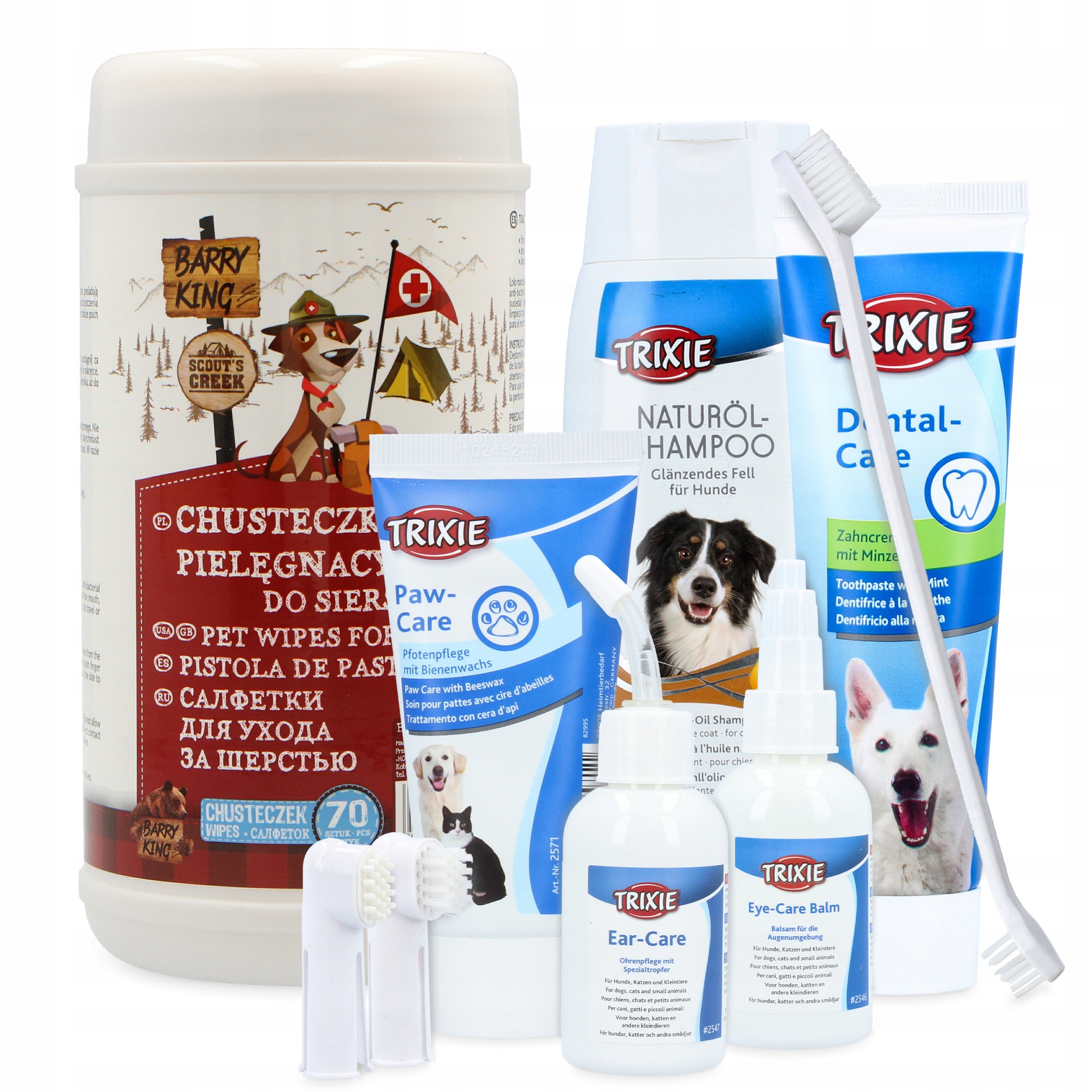 Жидкость для ушей 50 мл, капли для глаз 50 мл, крем для лап 50 мл, салфетки для шерсти 70 шт, зубные щетки 3 шт с зубной пастой 100 г мяты и шампунем с натуральными маслами 250 мл