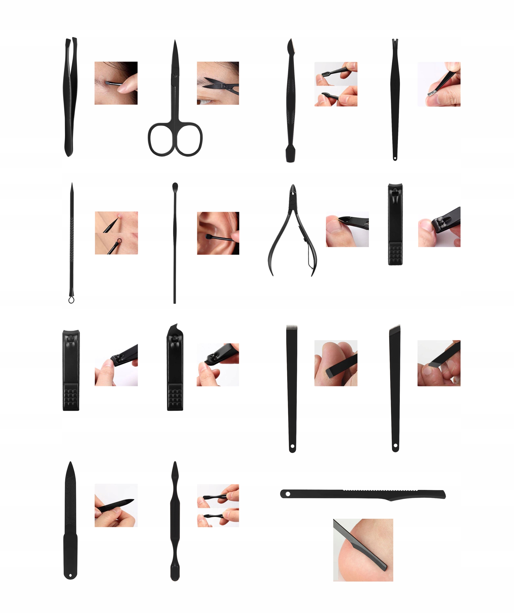 - ПОЛНЫЙ КОМПЛЕКТ ДЛЯ ЛЮБОЙ СИТУАЦИИ - набор состоит из 16 элементов. Кейс + 15 инструментов; для ухода за руками, ногами и лицом. Ниже приведен подробный список инструментов.