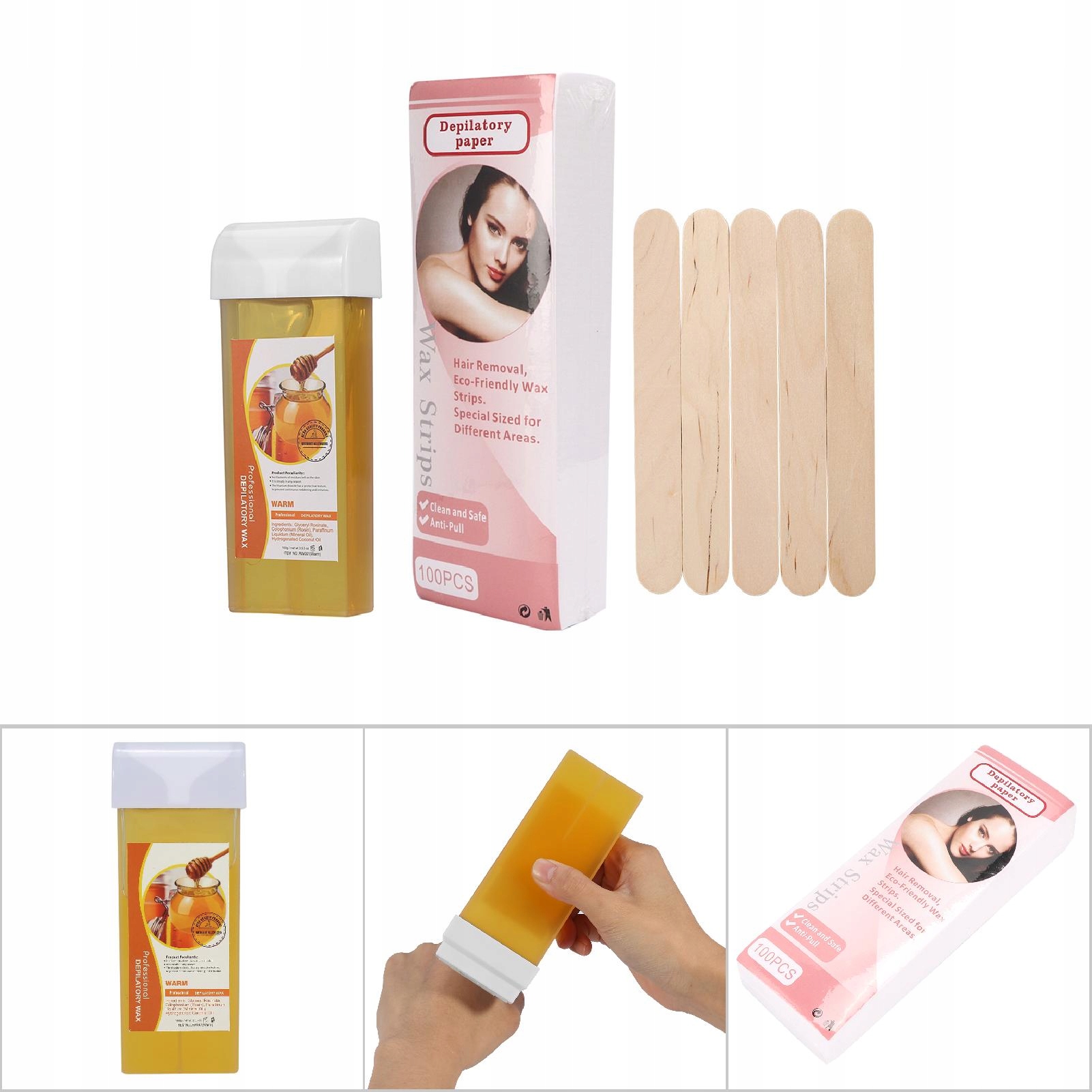 ⏺ Этот набор для депиляции включает 1 коробку 100 г воска для депиляции, 100 штук бумаги для депиляции и 5 деревянных шпателей.