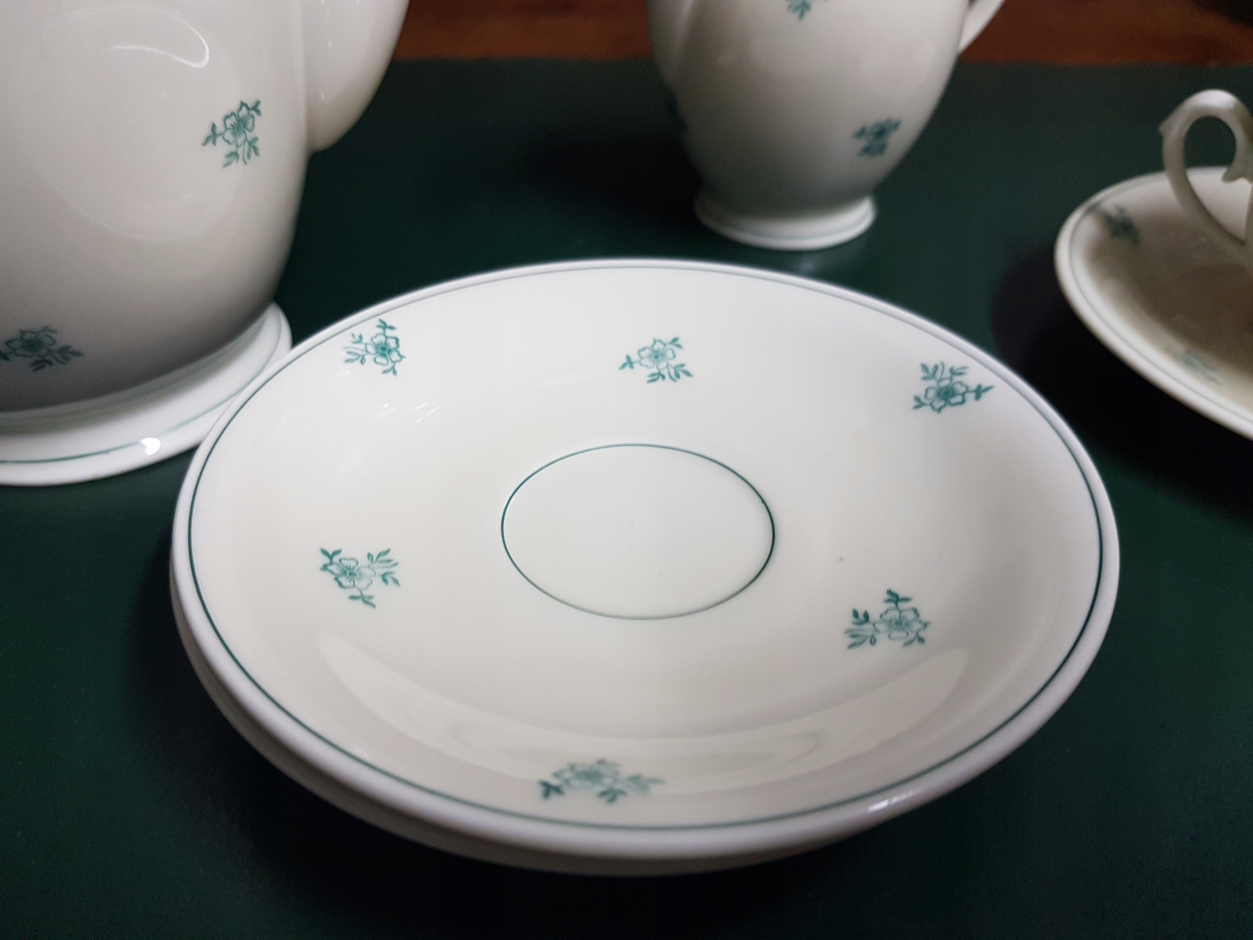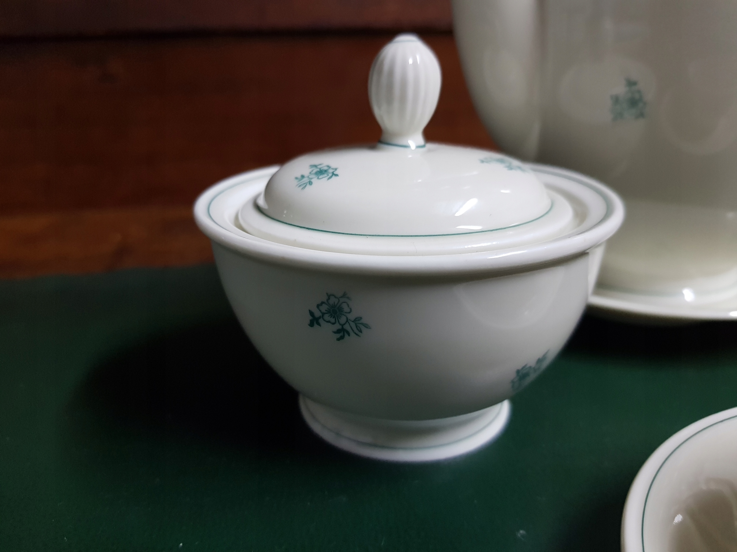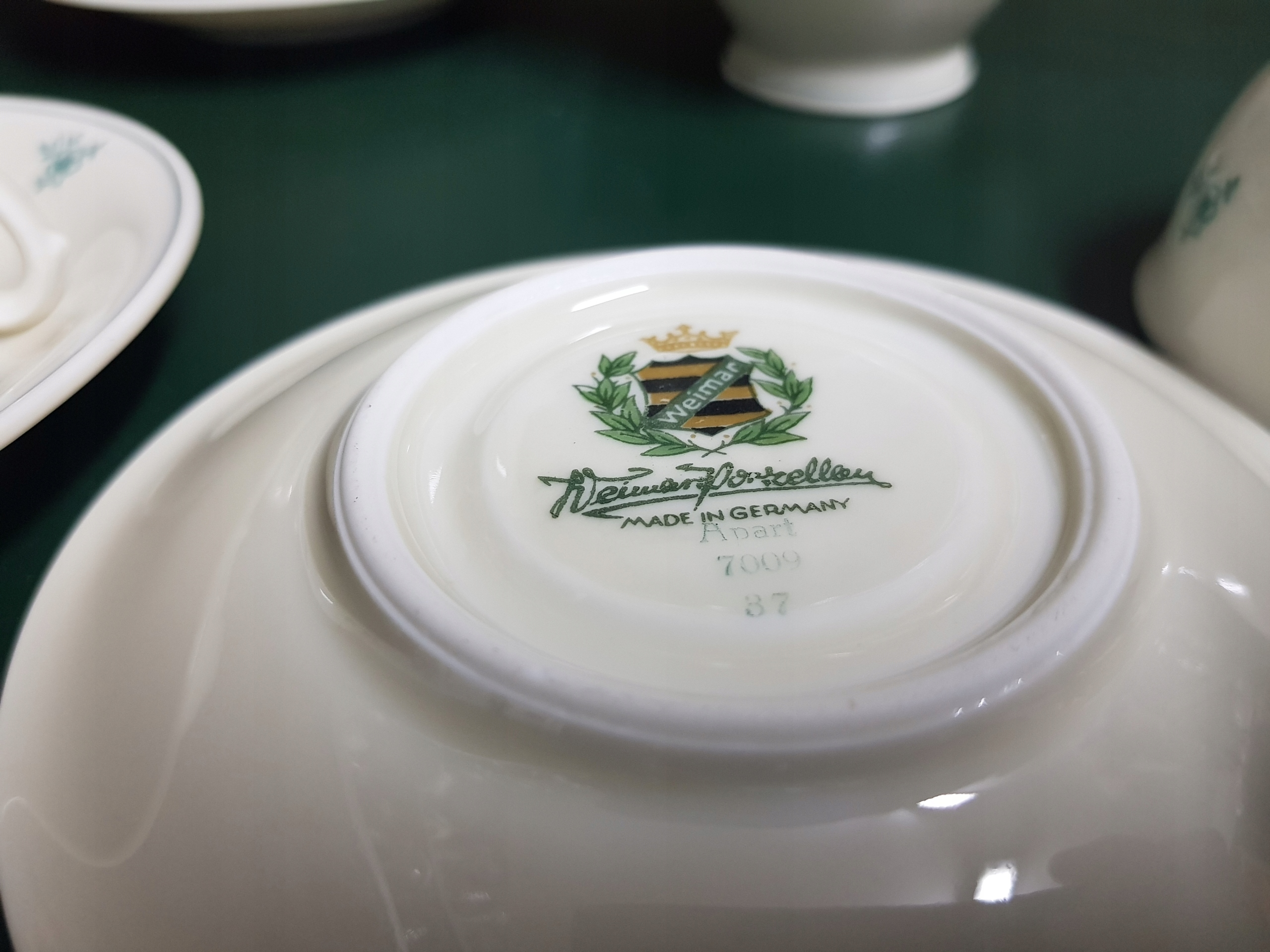 Предмет аукциона — сервиз мокко на двоих фирмы Weimar, модель Apart.1950-е годы.Фарфор кремового цвета.Оформление зелёное.