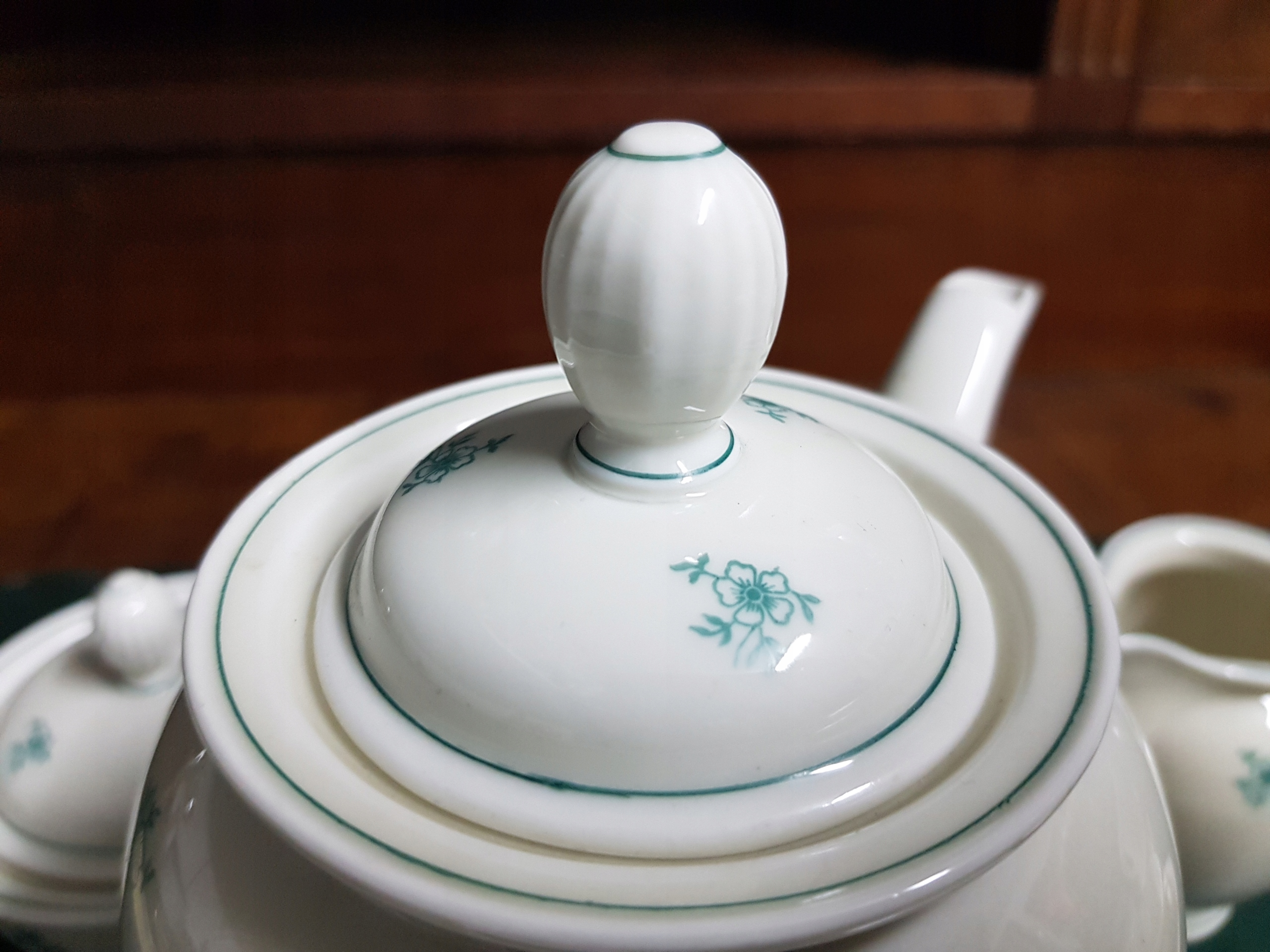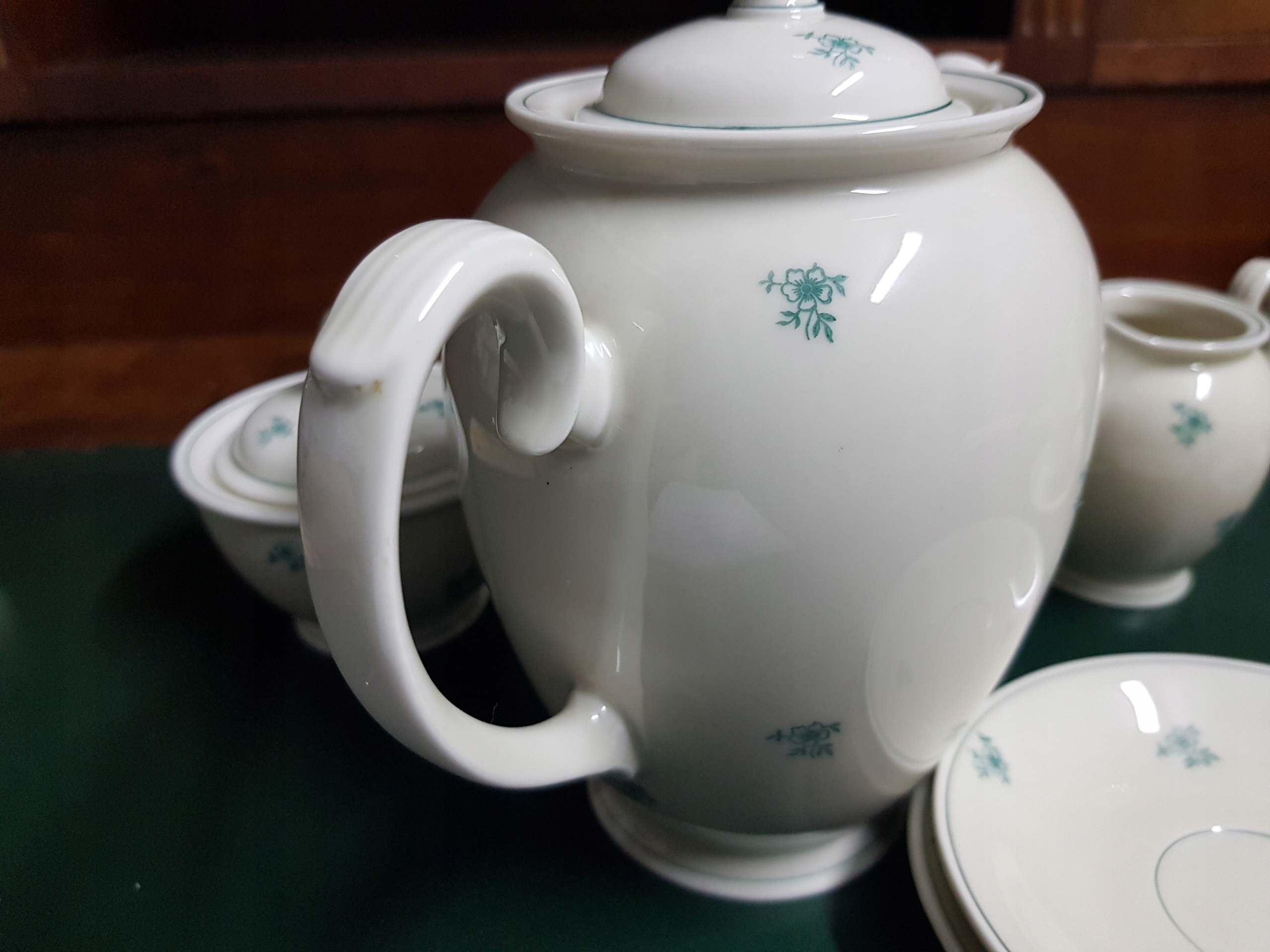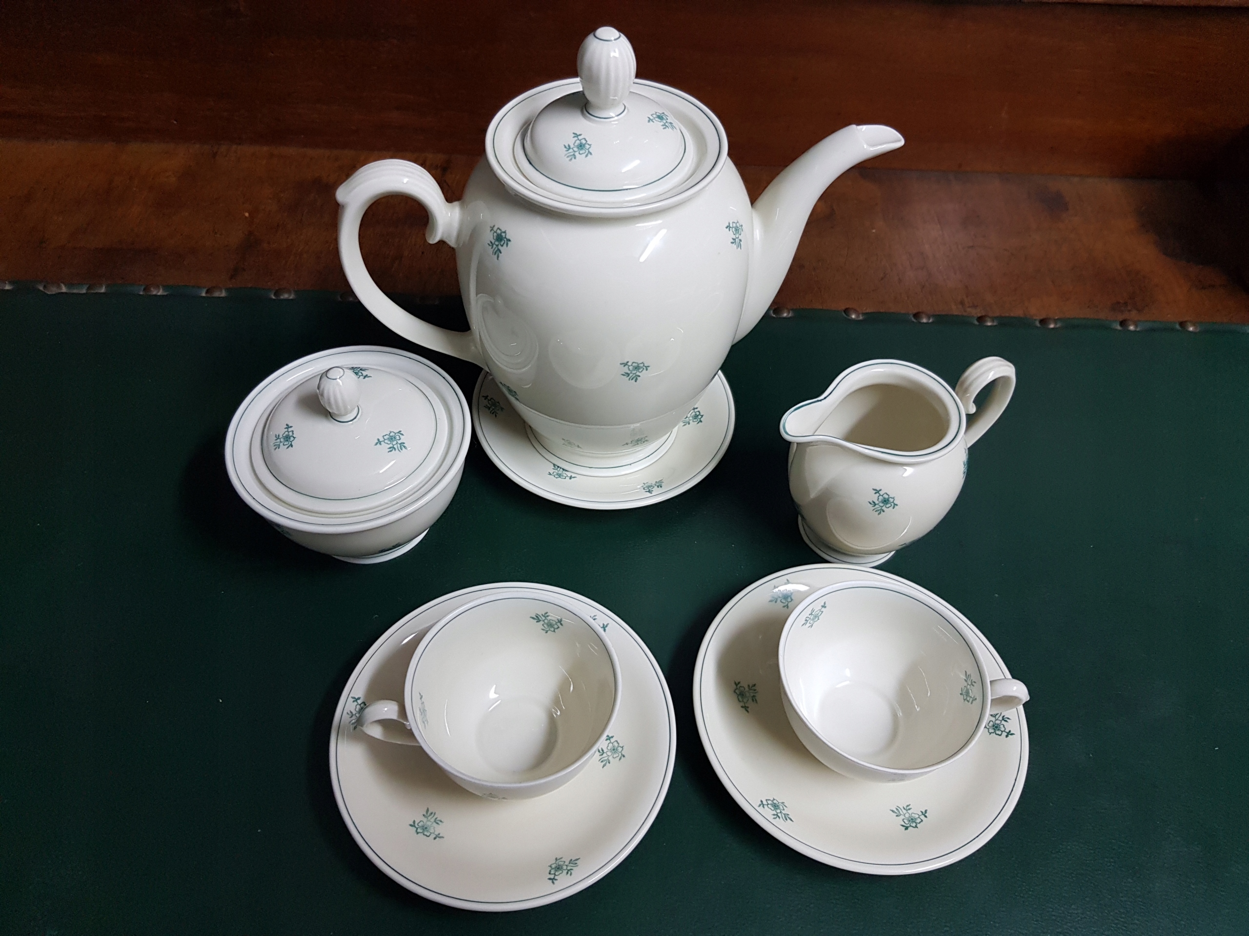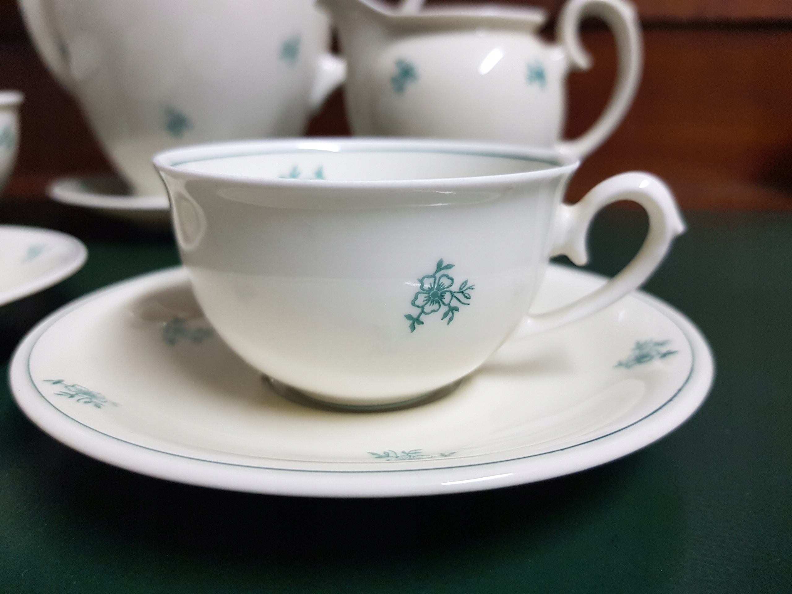 Предмет аукциона — сервиз мокко на двоих фирмы Weimar, модель Apart.1950-е годы.Фарфор кремового цвета.Оформление зелёное.