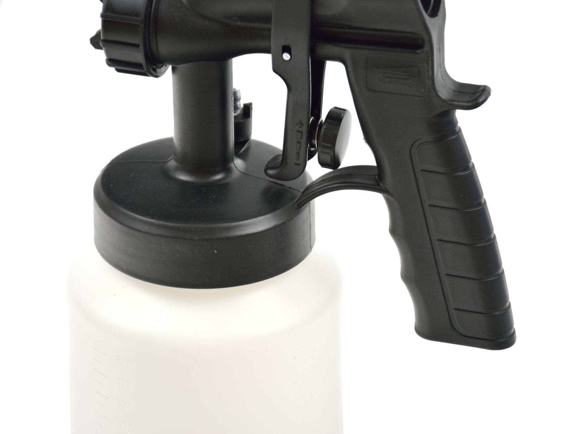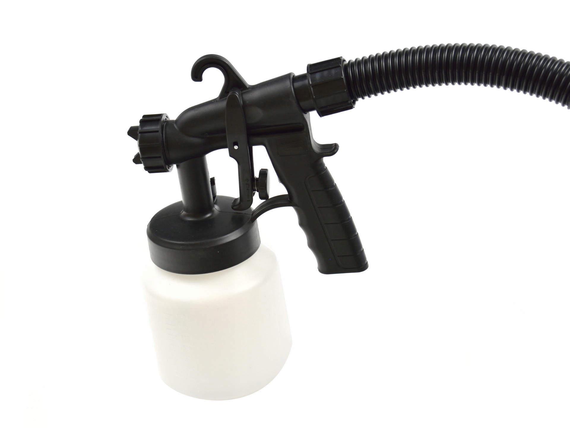 Пистолет для окраски поверхностей одним слоем краски, лака или морилки. Он позволяет добраться до труднодоступных мест, куда не может добраться валик или кисть. Позволяет равномерно покрыть различные типы поверхностей. Эффективность покрытия 10 – 15 м2/10 минут. Характеристики продукта: эффективный компрессор с двигателем мощностью 650 Вт, регулируемая насадка: вертикально, горизонтально, по диагонали, труба длиной 1,5 м, ремень для удобной переноски устройства на плече, вилка для измерения вязкости жидкости, пистолет с возможностью регулировка подачи жидкости, емкость для краски емкостью 800 мл, с мерным стаканчиком, указывающим количество оставшейся краски. Технические данные Напряжение питания: 230 В Максимальная мощность: 650 Вт Мощность распыления: 105 Вт Емкость: 10 - 15 м2/10 минут Вязкость: максимальная 130 DIN-сек. Рабочее давление: 3–4 PSI. Емкость бака: 800 мл.