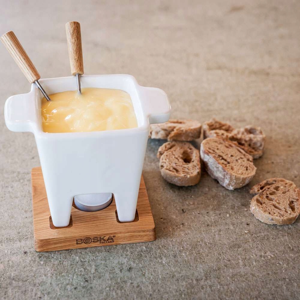 В аккуратном и компактном наборе для фондю на двоих от Boski есть все необходимое. Керамическое блюдо надежно стоит на четырех ножках на дубовой основе, в комплект входят 2 вилки из нержавеющей стали с деревянной отделкой и нагреватель. Керамическую посуду можно использовать в микроволновой печи, что значительно сокращает время приготовления фондю.