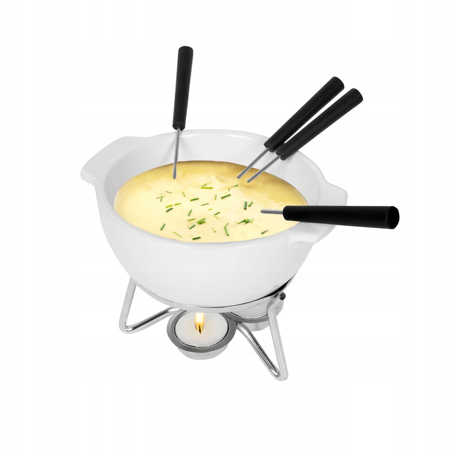 Набор для фондю Party 750 мл идеален для романтического вечера на двоих или для небольших встреч с друзьями и семьей. Керамика мягко передает тепло от трех нагревателей плавленному сыру, сохраняя его густым и гладким. Керамическую посуду можно использовать в микроволновой печи, что значительно сокращает время приготовления фондю. Существуют разные способы приготовления сырного фондю, но мы рекомендуем готовить его в емкости большего размера, а затем осторожно разливать. Емкость для фондю покрыта толстым слоем устойчивой к царапинам глазури. Белая керамическая миска с ручками и металлической подставкой – практичное решение. Все, что вам нужно сделать, это подготовить хлеб к обмакиванию!