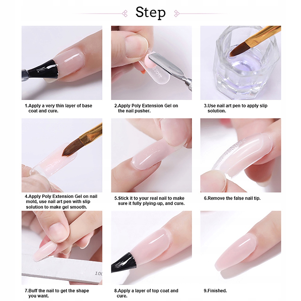 1. 1. Доступны различные цвета и стили, в том числе 8 цветов УФ-геля, 100 форм для наращивания ногтей, пилочки, кисти, мини-УФ-лампы, набор для удовлетворения различных потребностей в дизайне ногтей.