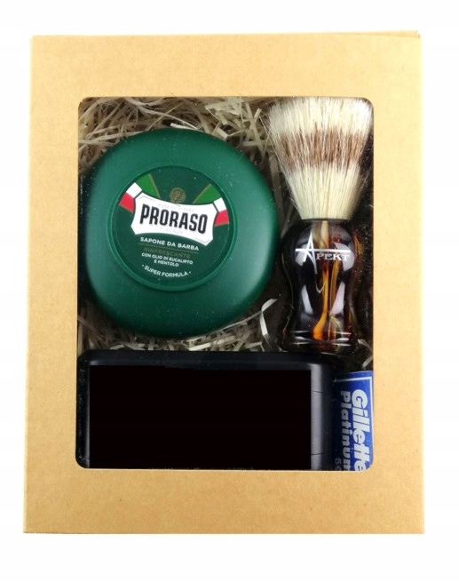 Набор из помазка для бритья с натуральной щетиной, мыла для бритья, бритвы и лезвий в экологической подарочной упаковке.
