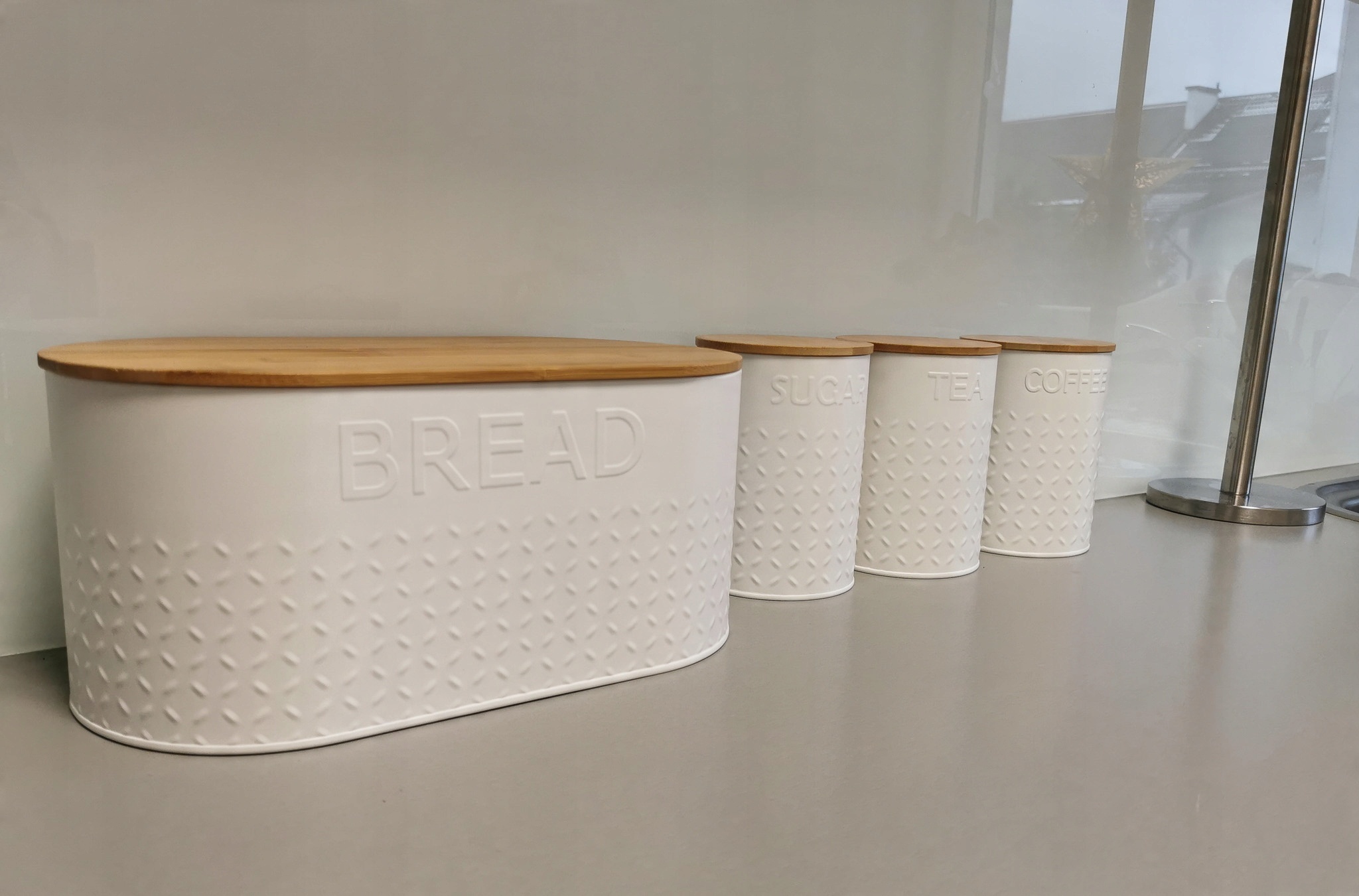 Хлебница и контейнеры для кофе, чая и сахара изготовлены из стали с порошковым покрытием и бамбукового дерева.