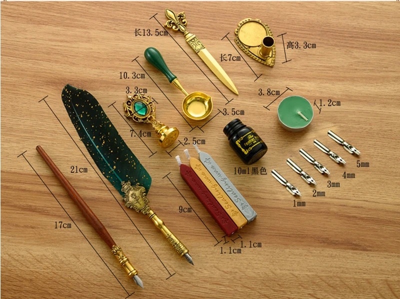 - В комплекте: 2 ручки, 1 восковой штамп, 3 восковые свечи, 5 запасных перьев разного размера (1–5 мм), 1 черная краска для письма, 1 свеча для подогрева воска, 1 насадка для воска, 1 нож для вскрытия писем, 1 шт. Подставка для ручек и чернил, 1 подарочная коробка