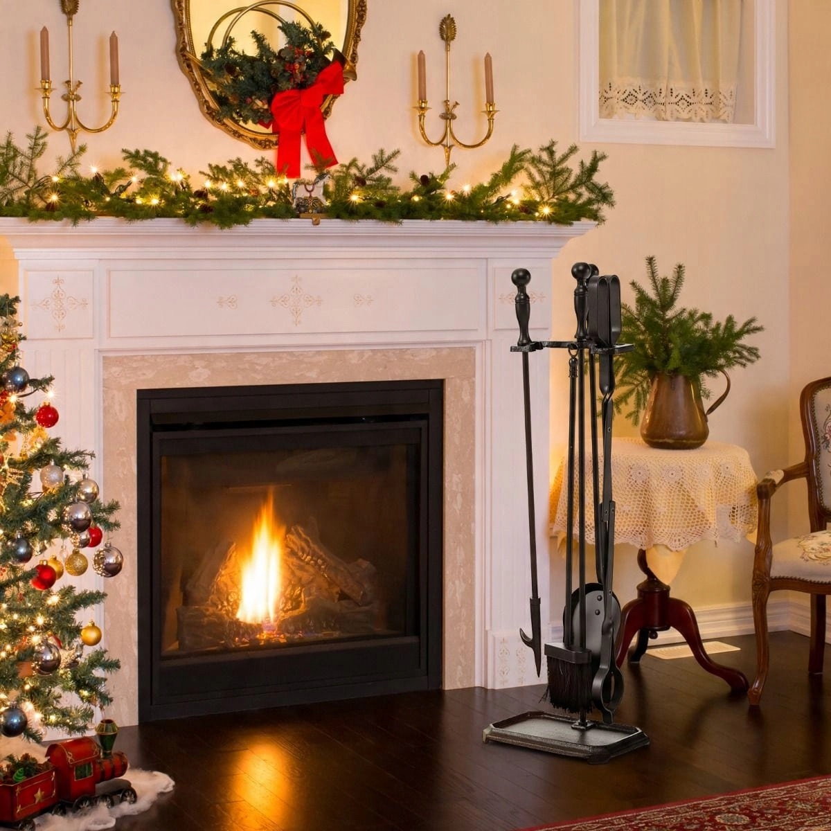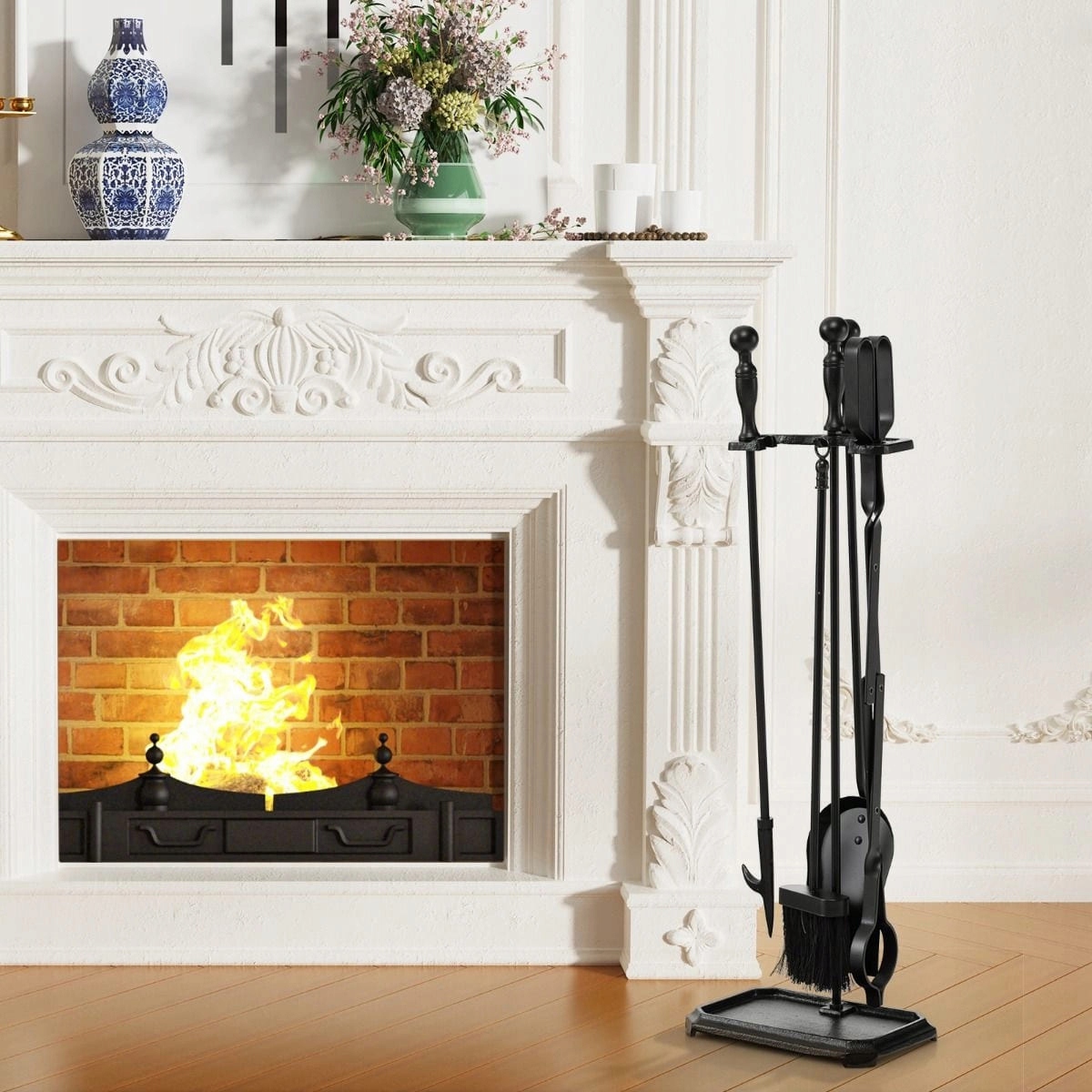 - Полезный набор инструментов для камина, включая лопату, кочергу, щипцы и подставку. >