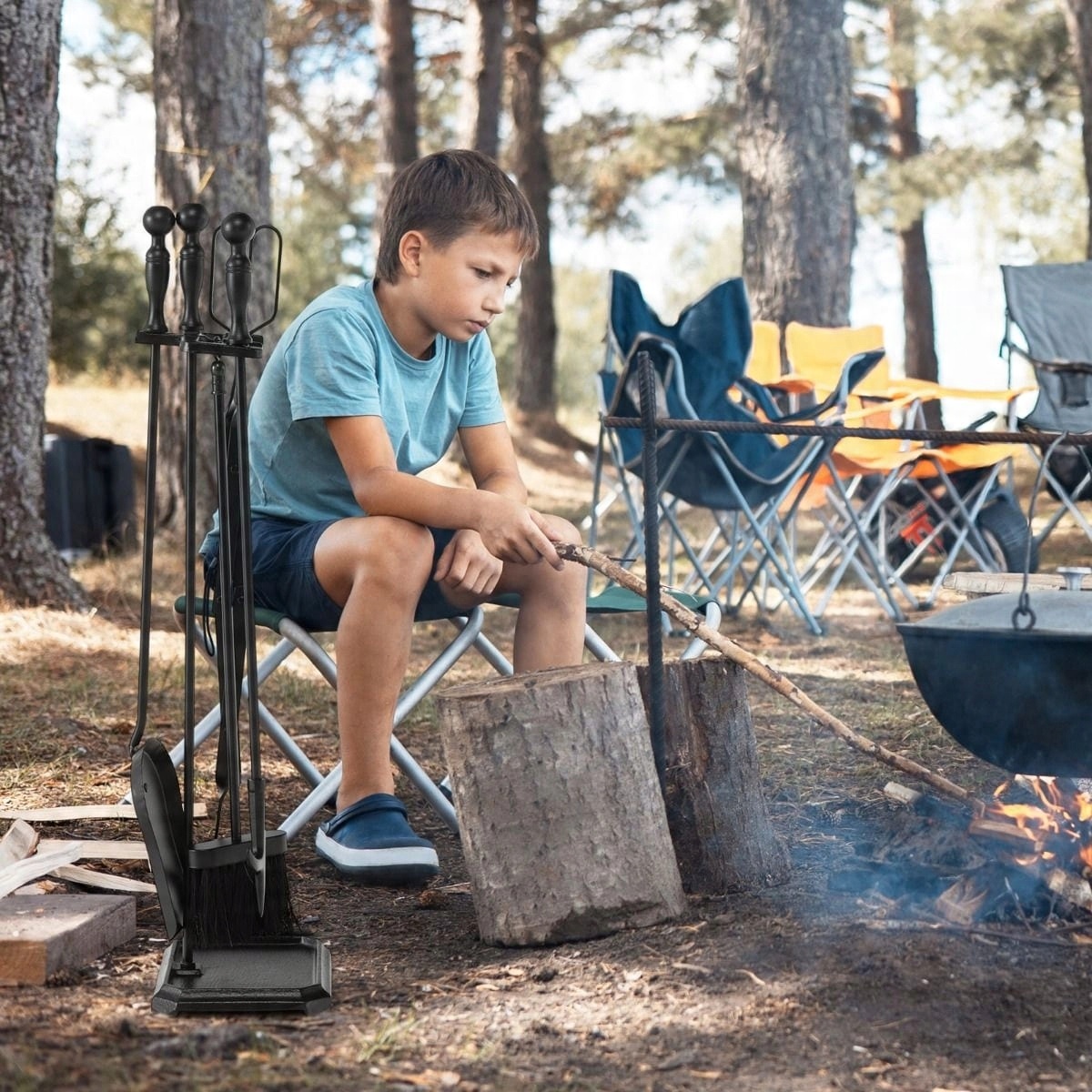 Набор из 5 каминных инструментов: содержит кочергу, щипцы, лопату, метлу и подставку, которые чрезвычайно практичны. Щипцы позволяют безопасно подбрасывать дрова в огонь, а кочерга идеально подходит для разжигания огня. Прочная лопата позволяет легко убрать золу и мусор.
