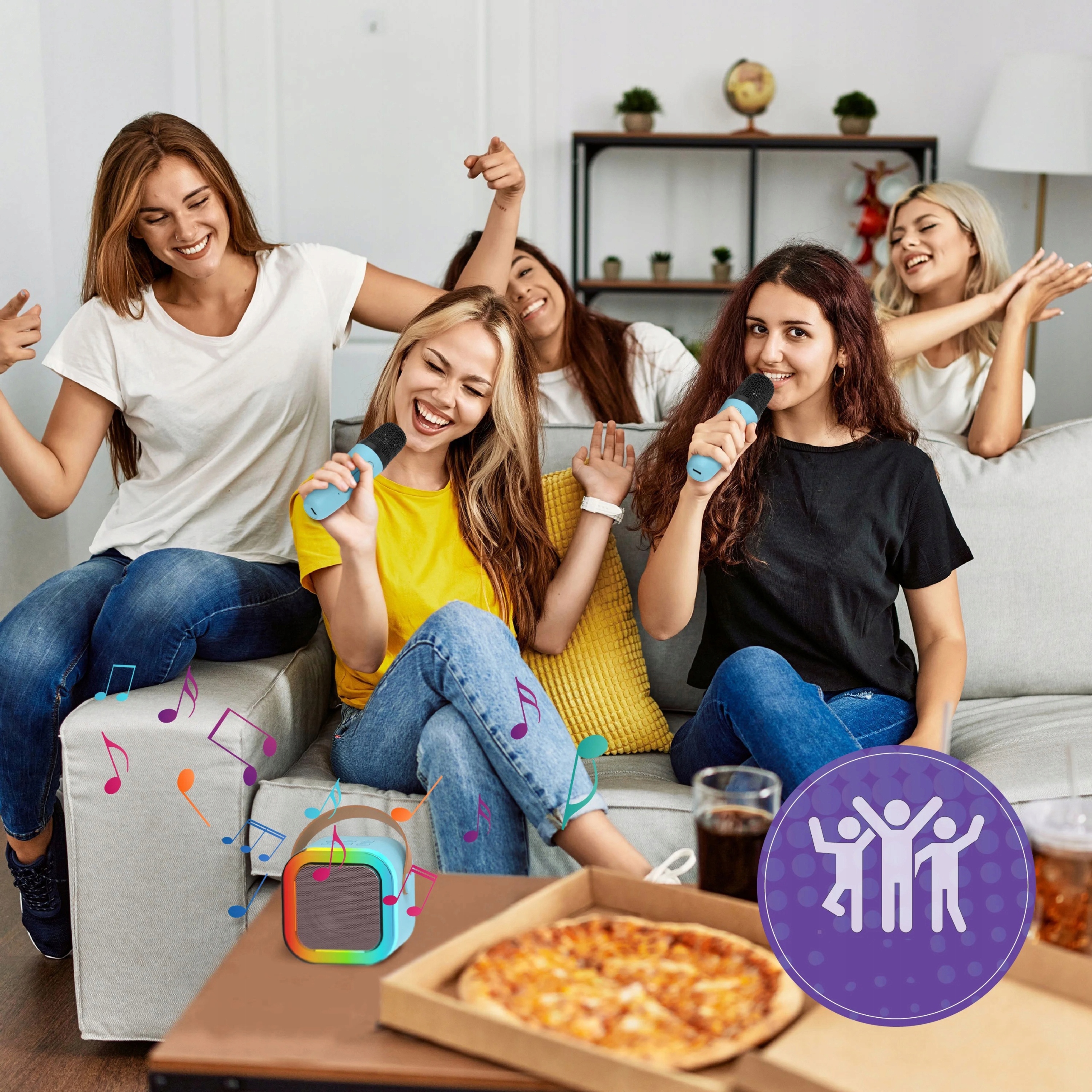 Поднимите свои вечеринки на новый уровень с нашим караоке-набором, который гарантирует незабываемое веселье! Этот компактный Bluetooth-динамик и два беспроводных микрофона — идеальное решение для всех, кто любит петь и веселиться. Благодаря мощному и чистому звуку динамика каждая песня будет звучать профессионально, а портативный дизайн позволяет легко разместить его где угодно — в гостиной, саду или на пляже.