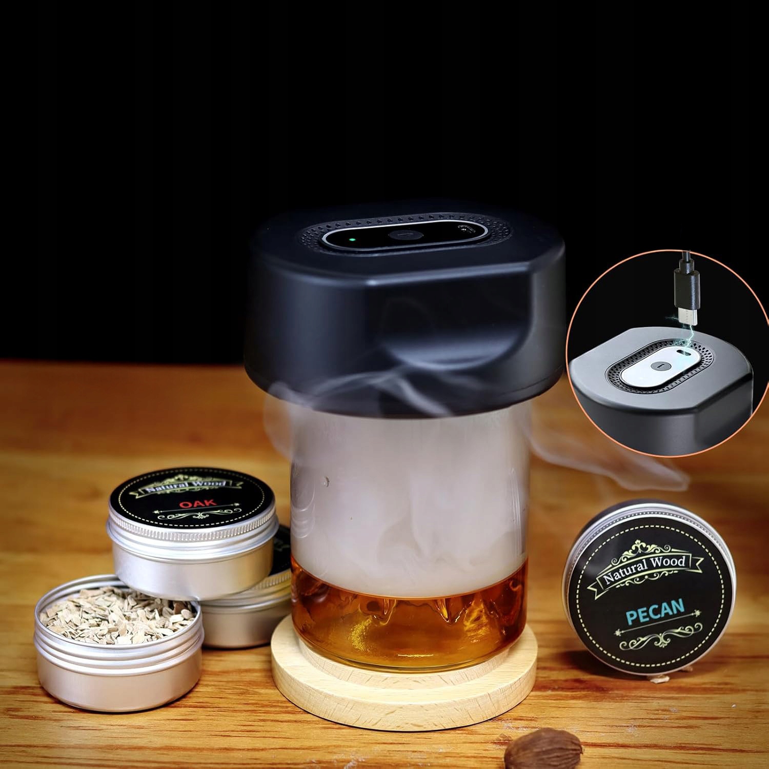 в наборе 6 высококачественных щепок (дуб, яблоня, гикори, вишня, груша, бук). Всего за 2 секунды дым придает напитку интенсивный аромат. Естественный аромат древесины выводит каждый глоток на новый уровень.