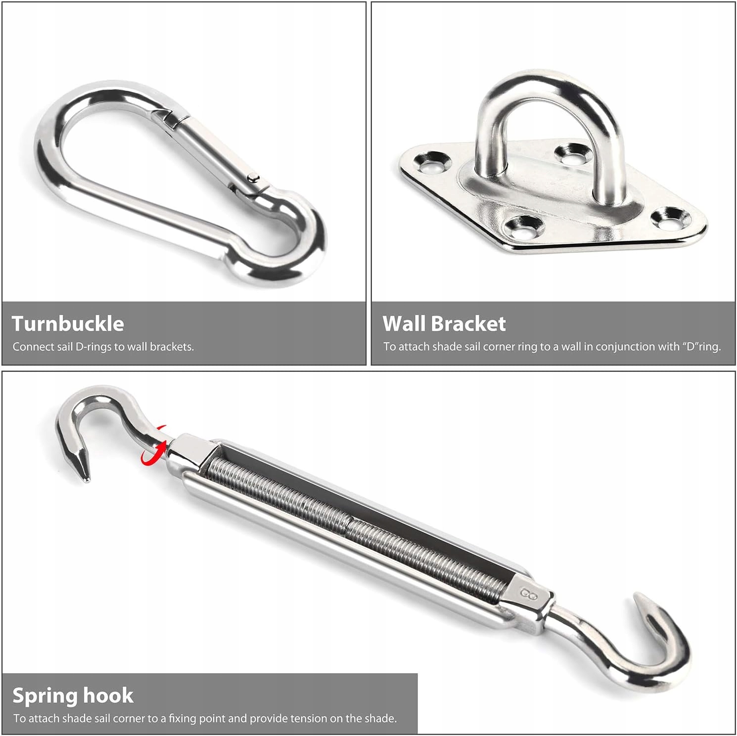 - Этот набор инструментов с карабинами, натяжными гайками и ручками позволяет легко и безопасно установить теневой парус.