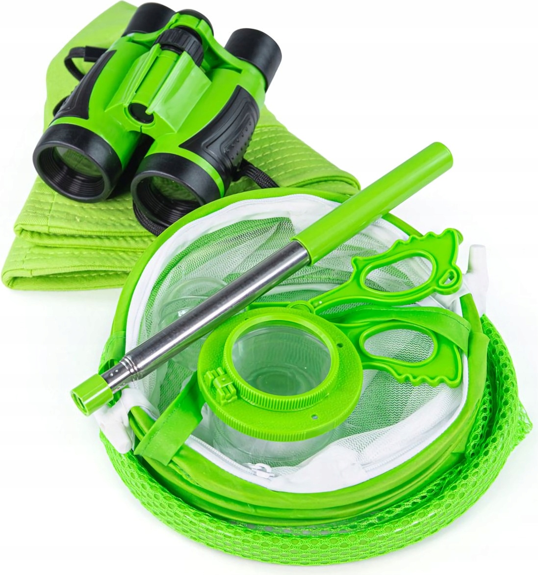 Сетка для ловли и нож позволяют детям легко и безопасно ловить различных насекомых. В контейнере и сетчатом мешке они смогут внимательно следить за своим уловом, ни от чего не убегая. Увеличительное стекло добавляет игре дополнительное измерение, позволяя детально изучить каждое маленькое существо. Благодаря биноклю для наблюдения за местностью или другими животными маленькие исследователи могут стать настоящими исследователями.